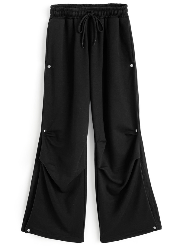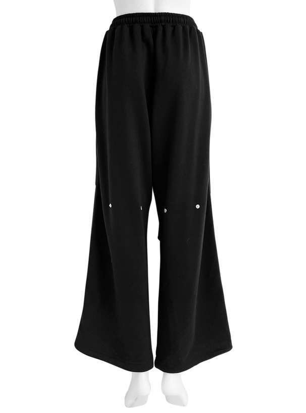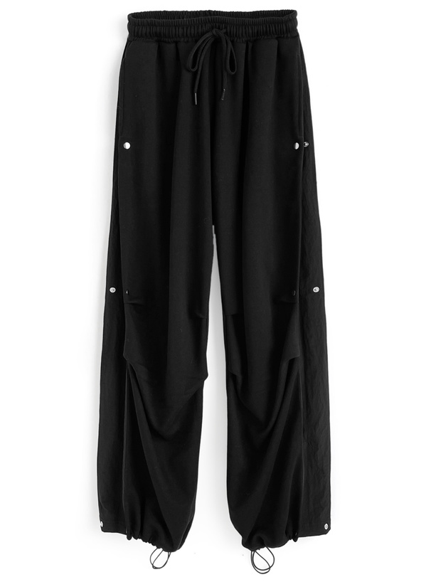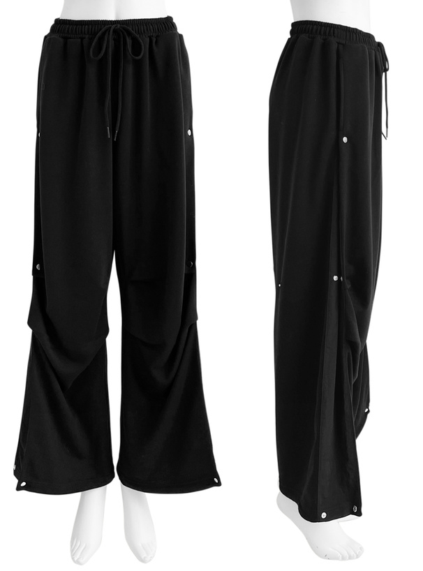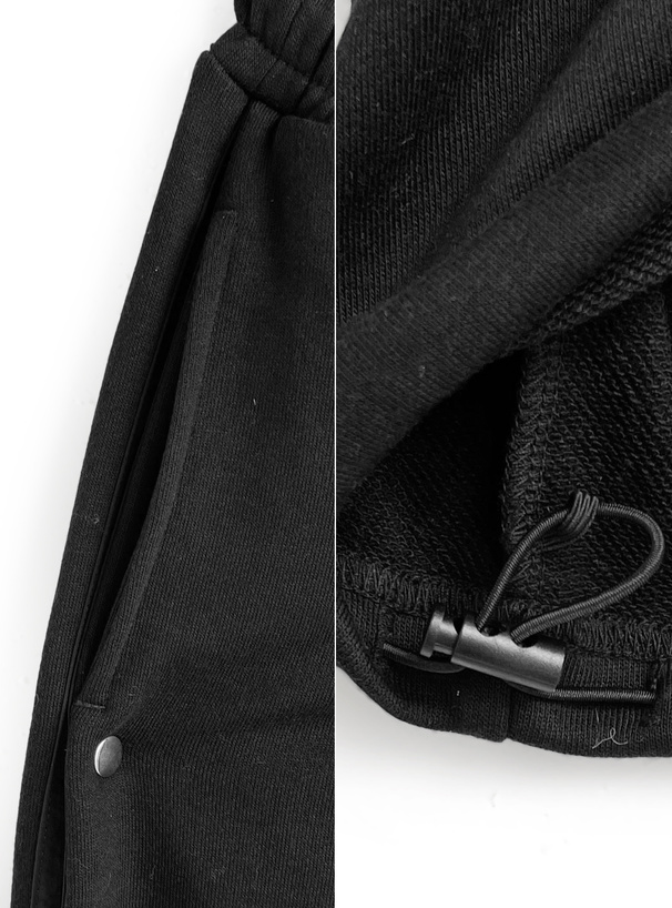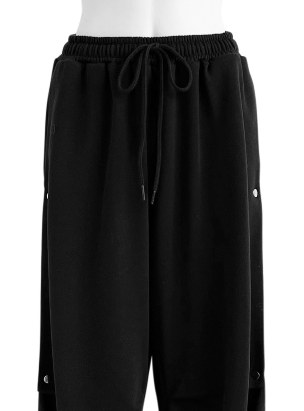 スポーティな印象を与える異素材のサイドラインは、横のボタンを閉じるとノーマルなパンツになる仕様。