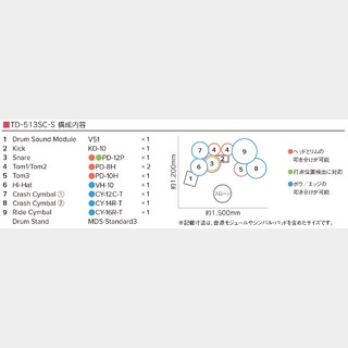 TD513SC-SとTD516では共通してハイハットスタンド、ドラムスローン(ドラムイス)、フットペダルを別途お求めください。