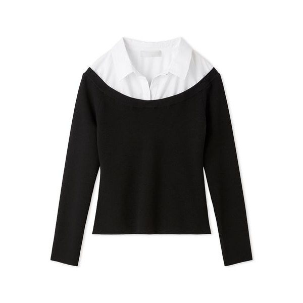 シャツとオフショルニットのレイヤード風ニットプルオーバー。