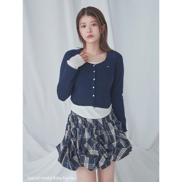 引き続きトレンドのレイヤードディティールを落とし込んだニット2枚組のアイテムが届きました。インのニットは大きく開いた襟ぐりがピコレース風のリブ編地で、カジュアルにも着られるデザインに仕上げています。袖や裾をアウトにニットより長めに設計しました。アウトのニットは、襟ぐりを大きく開けた、クリーンな天竺編みの襟付きカーディガンディティールで、抜け感がありながらもきちんと感をプラスした絶妙なバランスが魅力です。どちらもフィット感のあるデザインで、インとアウトのニットを逆にしてもご着用いただけます。シアー感はなく、それぞれ単品使いもしやすいデザインが魅力。胸元には、小さくSNIDELロゴメタルプレートをあしらい、上品に仕上げました。きちんと感のあるプリーツレイヤードミディスカート(SWFS255101)合わせがおすすめです。