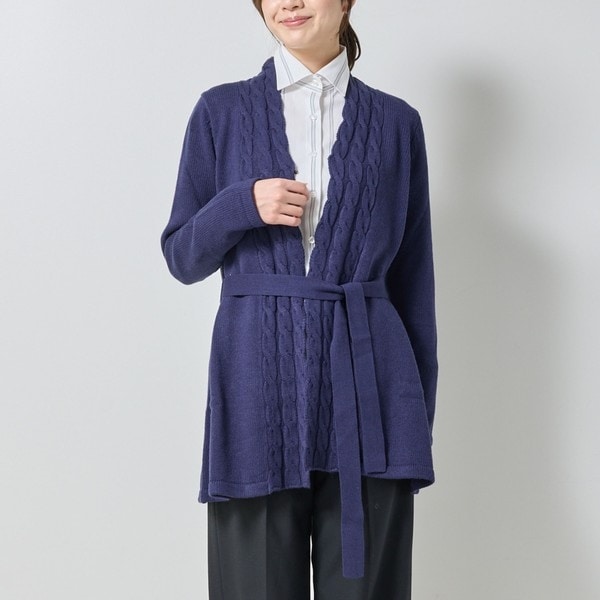 表情豊かなケーブル編みでアクセントを添えた、秋らしいカーディガン。腰元まで隠れる丈感が、気になるヒップ周りをしっかりとカバーし、付属の共生地ベルトでウエストを絞るだけで、脚長効果にも期待大。シンプルなデザインなので、オンオフ問わずコーディネートに取り入れやすく、暖冬に便利な薄手で適度な保温力を備えた優秀アイテムです。