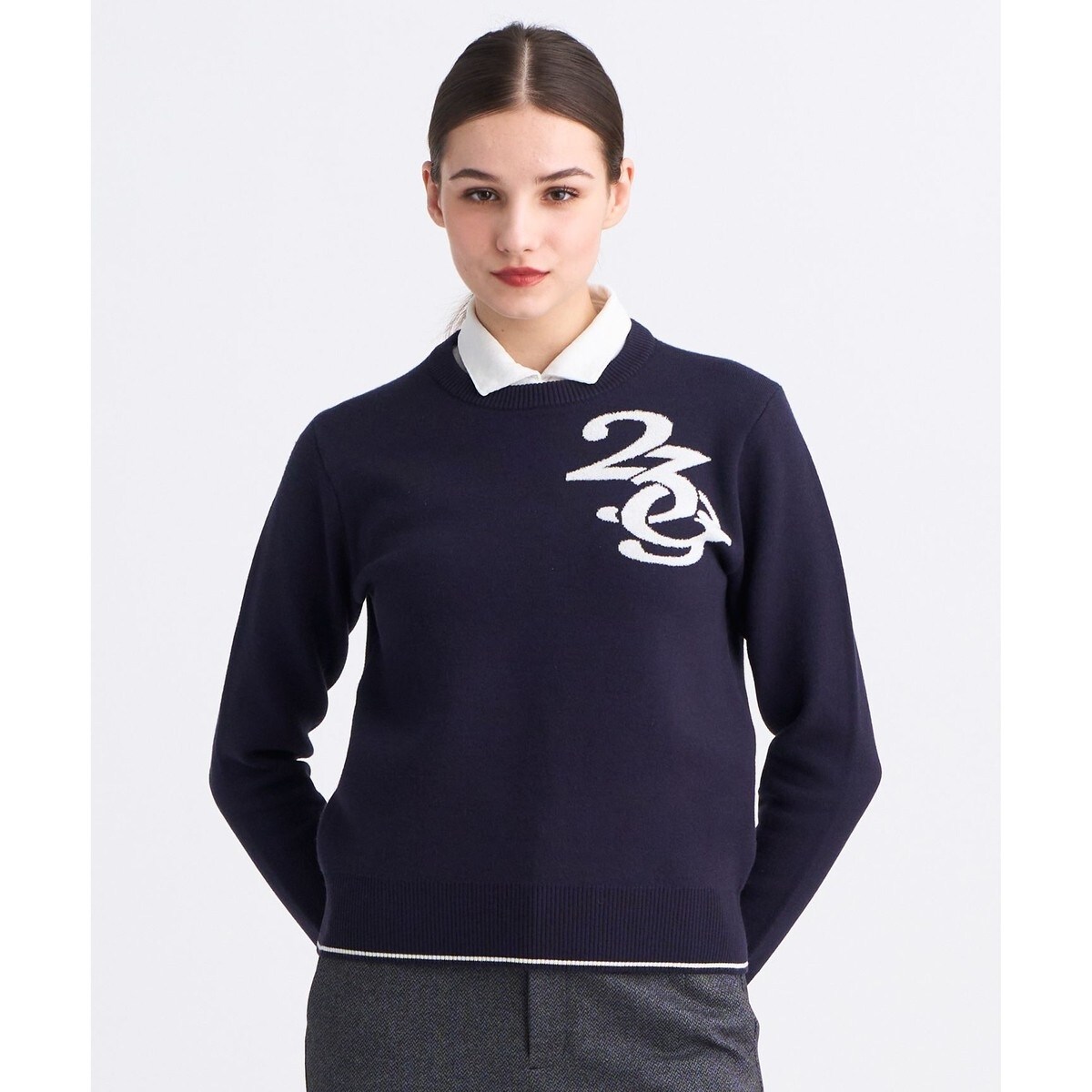 モチモチ感が心地よい、上品カジュアルを叶えるトレーナーライクなニット■デザインまるでトレーナーのような着心地の、クルーネックニット。シンプルながらも洗練されたデザインで、どんなスタイルにも合わせやすい万能アイテムです。左胸には毛足のある糸で立体的に表現された「23g」のロゴが施され、大胆なアクセントになっています。スポーティーながらも大人の上品なカジュアルスタイルを演出するアイテムです。首元がすっきりしているので、柄物のポロシャツやモックネックとレイヤリングしてもまとまりやすい便利なニット。