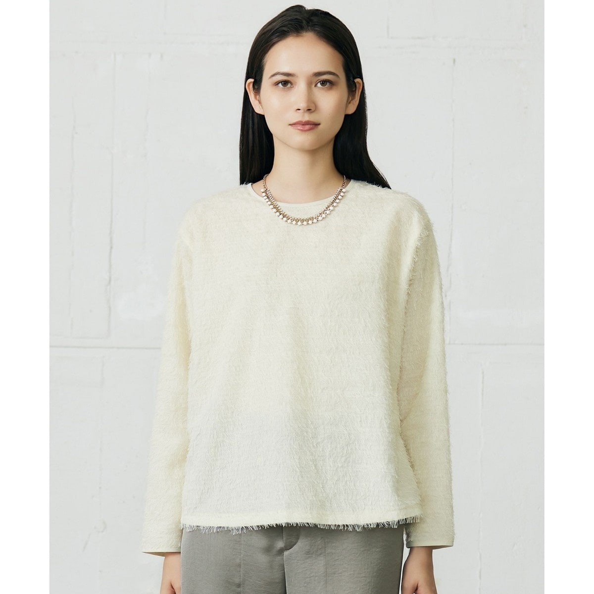華やかなジャカードを使用したコーディネートのアクセントになるブラウス■デザイン素材の表情を生かしたシンプルなプルオーバーブラウスです。トレンドのジャカード素材が大人っぽく程よく華やかな印象です。袖ぐりを低く設定し、ドルマンスリーブのような抜け感を感じられるバランス感でお作りしました。■素材繊細な毛足が特徴のカットジャカード素材です。トリアセテートの程よい光沢感とポリエステルの軽さが特徴です。生地の全面にカットジャカードを入れることで、程よい華やかさのある素材に仕上がりました。■同素材アイテムワンピース(OPWRGW0505)