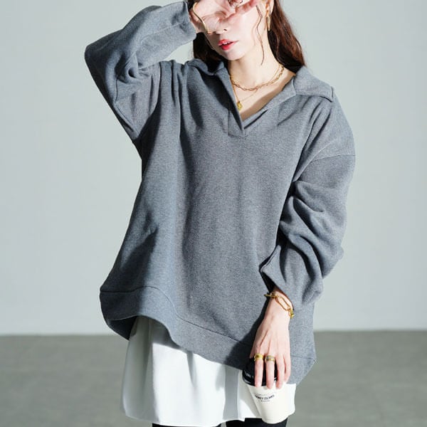 ラフに着れて即洒落見えする裏起毛スキッパーカラープルオーバーの登場です☆体型を拾わないゆったり身幅&袖幅でゆとりのあるサイズ感でリラクシーな着心地☆お尻がしっかり隠れる長めの着丈で気になるヒップラインをカバー♪ゆったりと開いたスキッパーカラーが大人っぽさのある抜け感を演出し小顔見せしてくれます◎どんなボトムスにも合わせやすいシンプルデザインで着回し力抜群◎肌触り柔らかな裏起毛素材で肌寒い季節に大活躍間違いなしの一着です!
