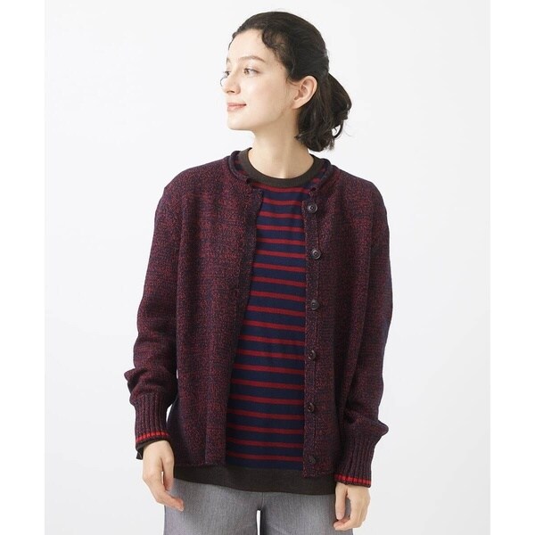 上品なクルーネックのカーディガンは、くるんとした襟元のデザインがアクセント。