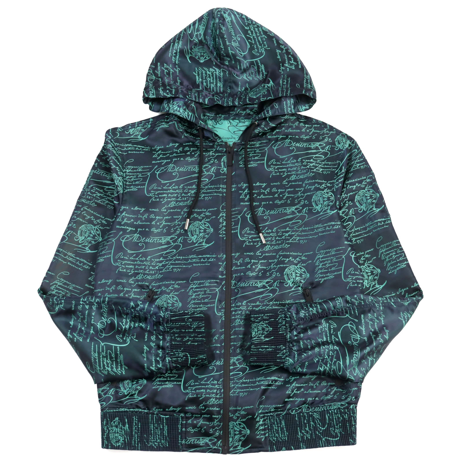 【ドンドン見直し】未使用品○Berluti ベルルッティ R17OBU68PADX カリグラフィ総柄 スクリットプリント ロゴドローコード付き パーカー/ブルゾン ネイビー グリーン R44 イタリア製 正規品 メンズ
