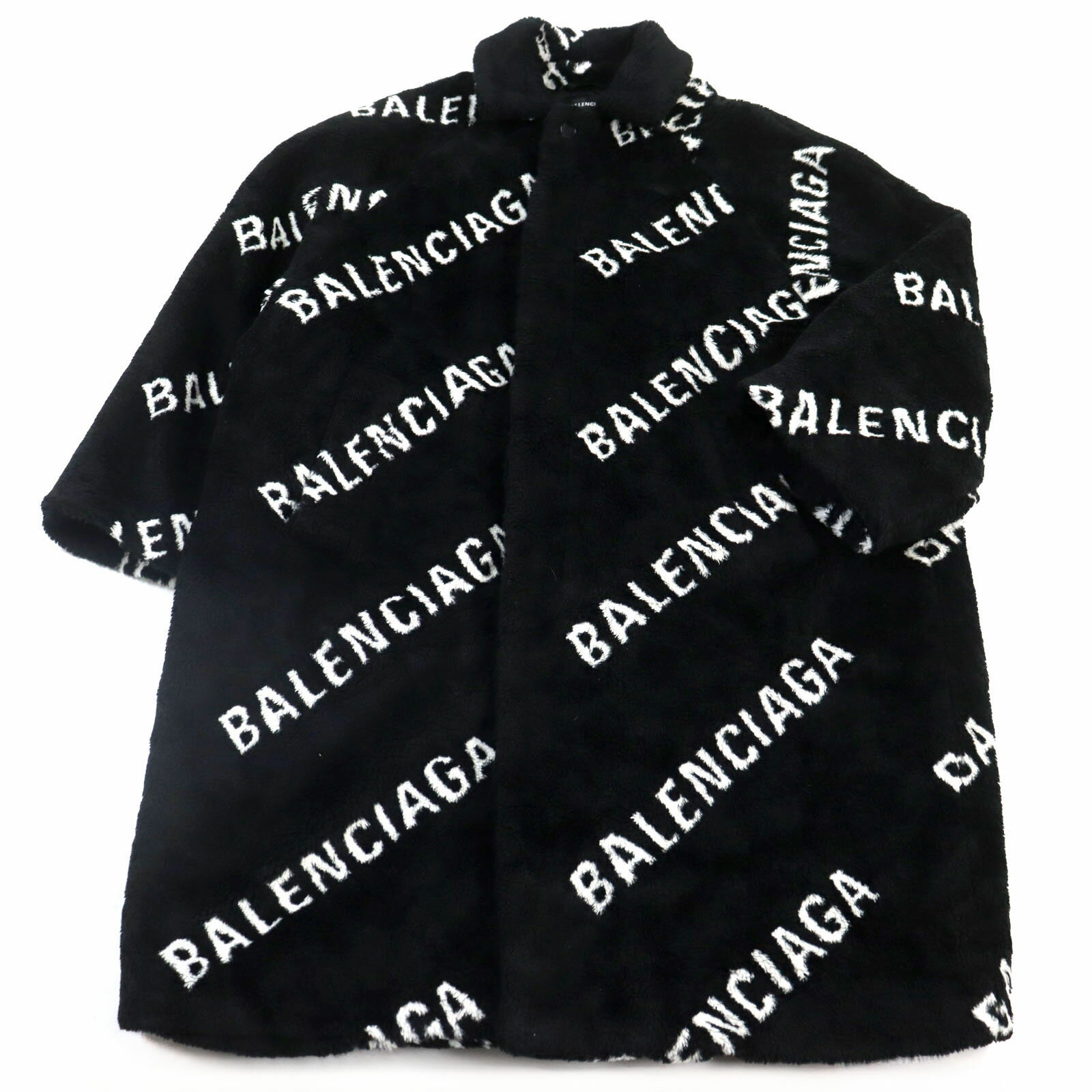 【ドンドン見直し】極美品○BALENCIAGA バレンシアガ 19AW 595827 TGQ02 ロゴ総柄 オーバーサイズ フェイクファー 中綿入り 裏地キルティング ロング丈 コート ブラック ホワイト 46 フランス製 正規品 メンズ
