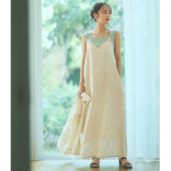 ドット柄のキャミワンピースは、清涼感のある素材感で仕上げられています。