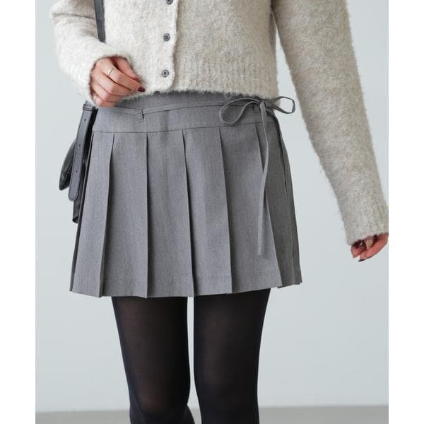 ラップスカートにもできるプリーツミニスカート。無地は杢調の合繊素材でどんなトップスにも合わせやすく、ブラウンはトレンドのタータンチェックの組み合わせで今年らしい印象に見せてくれます。ナローリボンでフェミニンなディテールをプラスしており、リボンを抜いても着用可能。開き部分は内比翼で全て閉じるとミニスカートとして、下のボタンを開けるとデニムなどワイドボトムとも合わせやすいラップスカートとして着こなせます。敢えてオーバーサイズなニット合わせでゆるっとした着こなしがおすすめ!※モデルの着用画像の場合、光の当たり具合により、実際の色味と異なって見えることがございます。色味は、商品単体の画像をご参照ください。