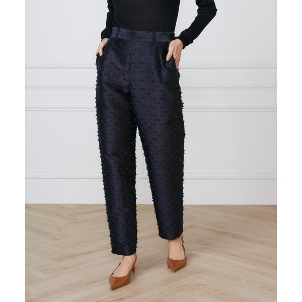 独特なハリ感が特徴の素材を使用したジャガードパンツ。ネイビーはランダムに入っているリボンカットがアクセントに。程よくリラックス感のあるラフな印象に仕上げました。ウエストはタックを施しすっきりと、足回りは程よく身体から泳ぐサイジングのテーパードシルエットが上品でクラッシックな雰囲気を演出し、きちんと感もありつつ脚をきれいにみせてくれます。・ポケットあり・左ファスナーあり■下げ札サイズ表記2=(M/9号)3=(L/11号)同素材のコート品番:7150114901■サンプル撮影商品■こちらの商品はサンプルでの撮影となっております。実際の商品とは、サイズや色味、素材、デザイン等の仕様が若干変更になる場合がございます。