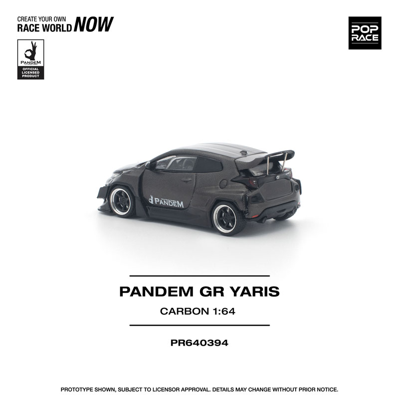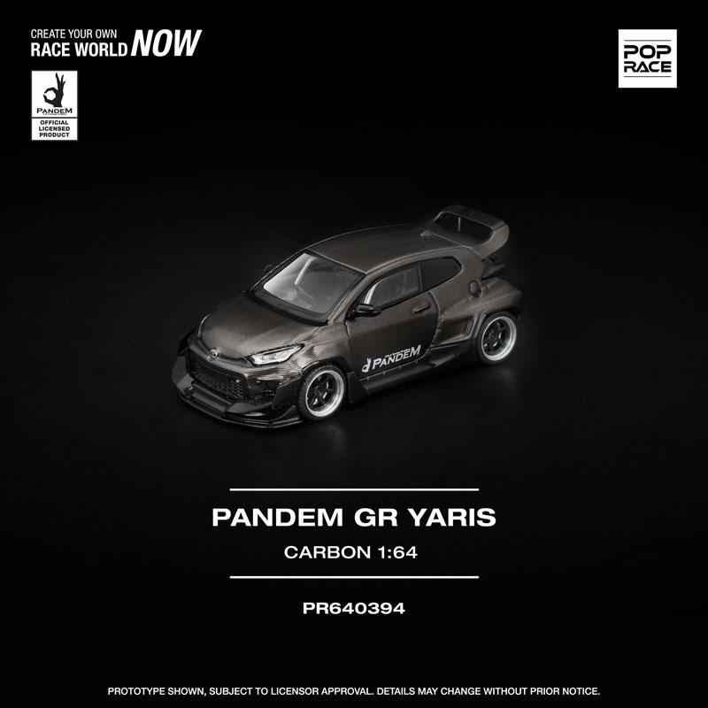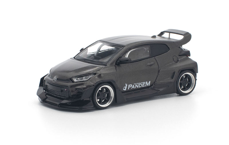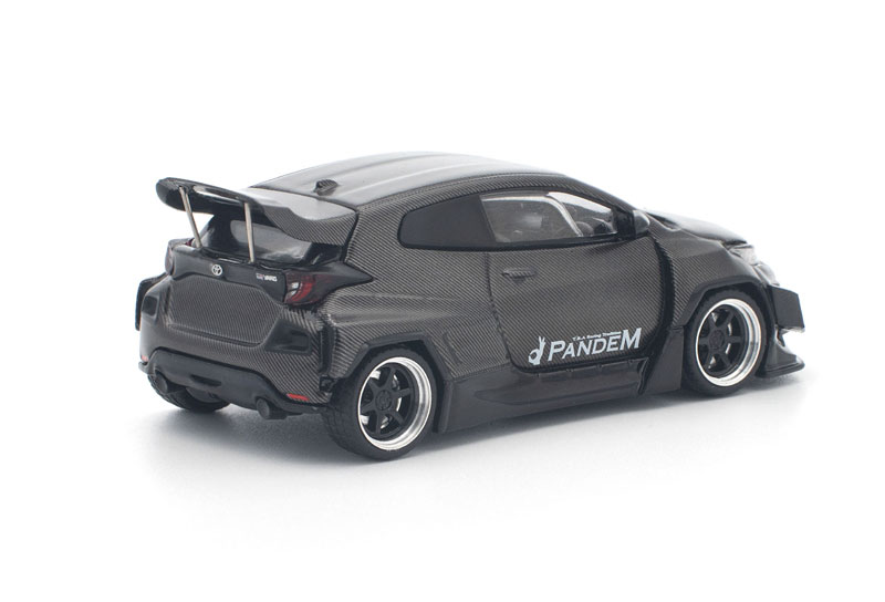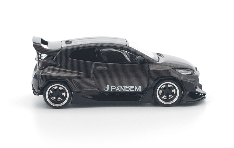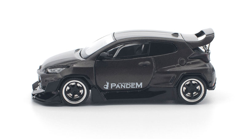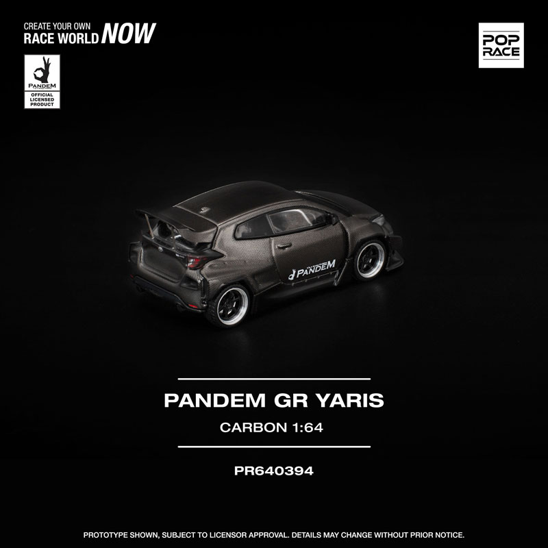 PANDEM仕様のGRヤリスが、カーボンファイバー調の外装をまとった「CARBON EDITION」として登場。 ボディ全体を覆うカーボンテクスチャが独特の存在感を放ち、コレクションを一段と引き立てます。 POP RACEならではの精密な造形と仕上がりで、リアルなディテールを1/64スケールに凝縮した特別モデルです。