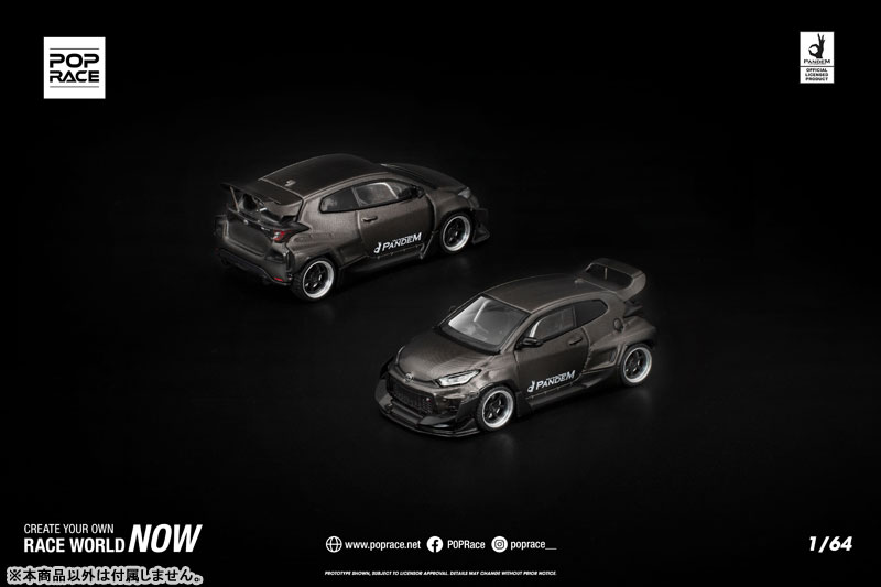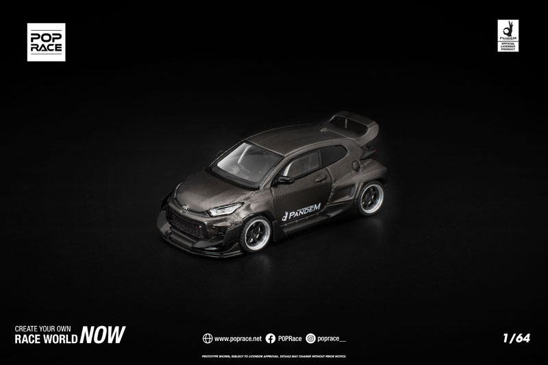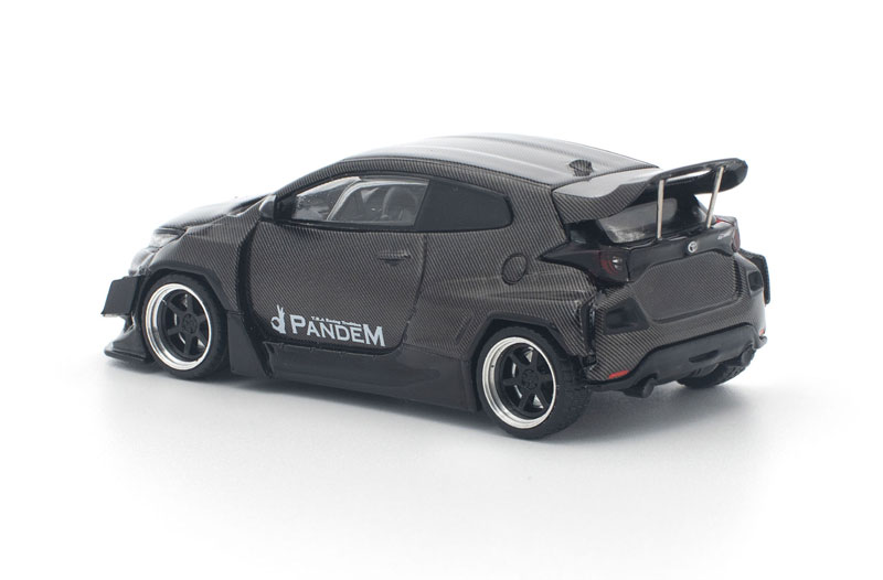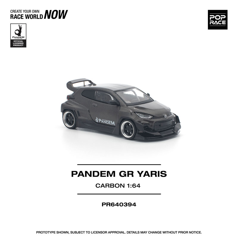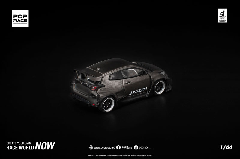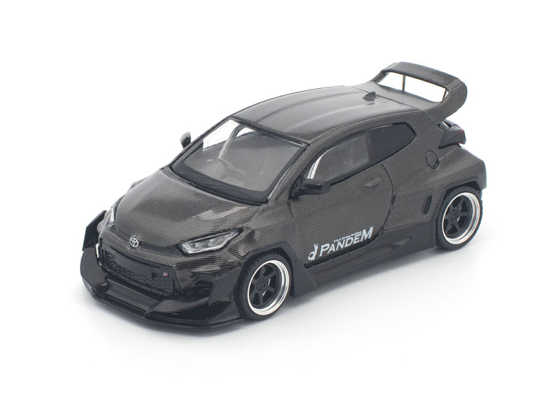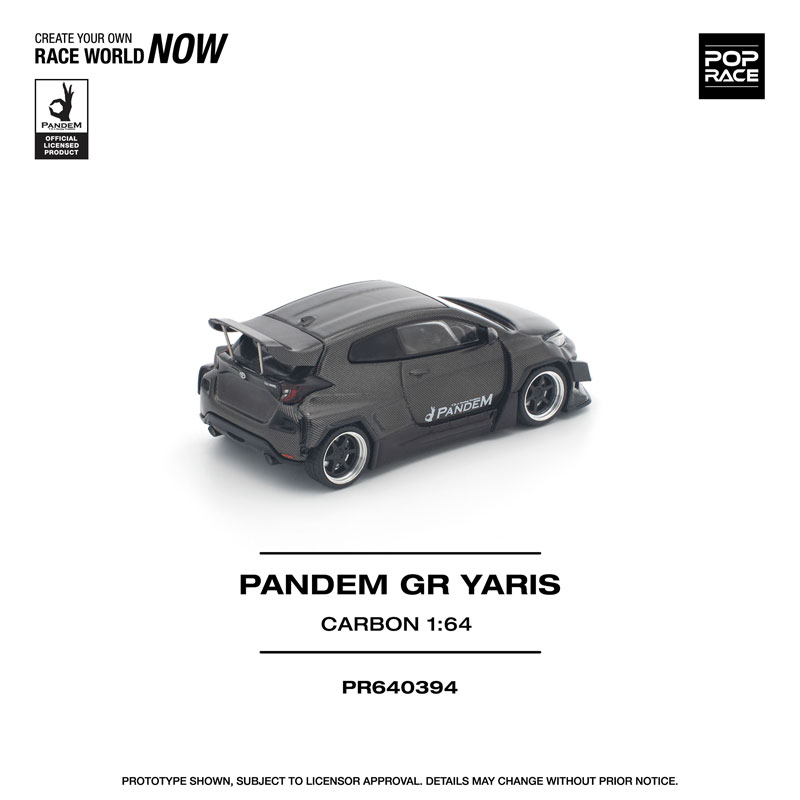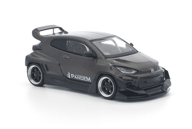 PANDEM仕様のGRヤリスが、カーボンファイバー調の外装をまとった「CARBON EDITION」として登場。 ボディ全体を覆うカーボンテクスチャが独特の存在感を放ち、コレクションを一段と引き立てます。 POP RACEならではの精密な造形と仕上がりで、リアルなディテールを1/64スケールに凝縮した特別モデルです。