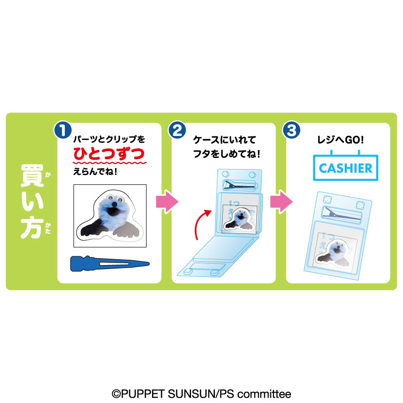 12柄のアクリルパーツと4色のヘアクリップからそれぞれひとつずつ選んで、ケースに入れて購入します。