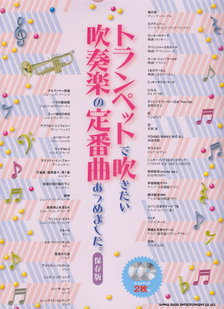 1:アルヴァマー序曲 ▼[Disc-1] 2:バラの謝肉祭 3:ラッパ吹きの休日 4:アフリカンシンフォニー 5:コパカバーナ 6:マンボ No.5 7:ラプソディインブルー 8:行進曲「威風堂々」第1番 9:双頭の鷲の旗の下に 10:雷神 11:星条旗よ永遠なれ 12:ワシントンポスト 13:テキーラ 14:エルクンバンチェロ 15:聖者の行進 16:アメリカンパトロール 17:シングシングシング 18:インザムード 19:ムーンライトセレナーデ 20:紫の炎 21:セプテンバー ▼[Disc-2] 22:ロッキーのテーマ 23:アベンジャーズのテーマ 24:ホールニューワールド 25:くまのプーさん 26:ミッキーマウスマーチ 27:U.S.A. 28:ダンシングヒーロー(Eat You Up) 29:紅 30:恋 31:YOUNG MAN(Y.M.C.A.) 32:サウスポー 33:シュガーソングとビターステップ 34:前前前世(movie ver.) 35:宇宙戦艦ヤマト 36:銀河鉄道999 37:ルパン三世のテーマ’78 38:タッチ 39:残酷な天使のテーゼ 40:宝島
