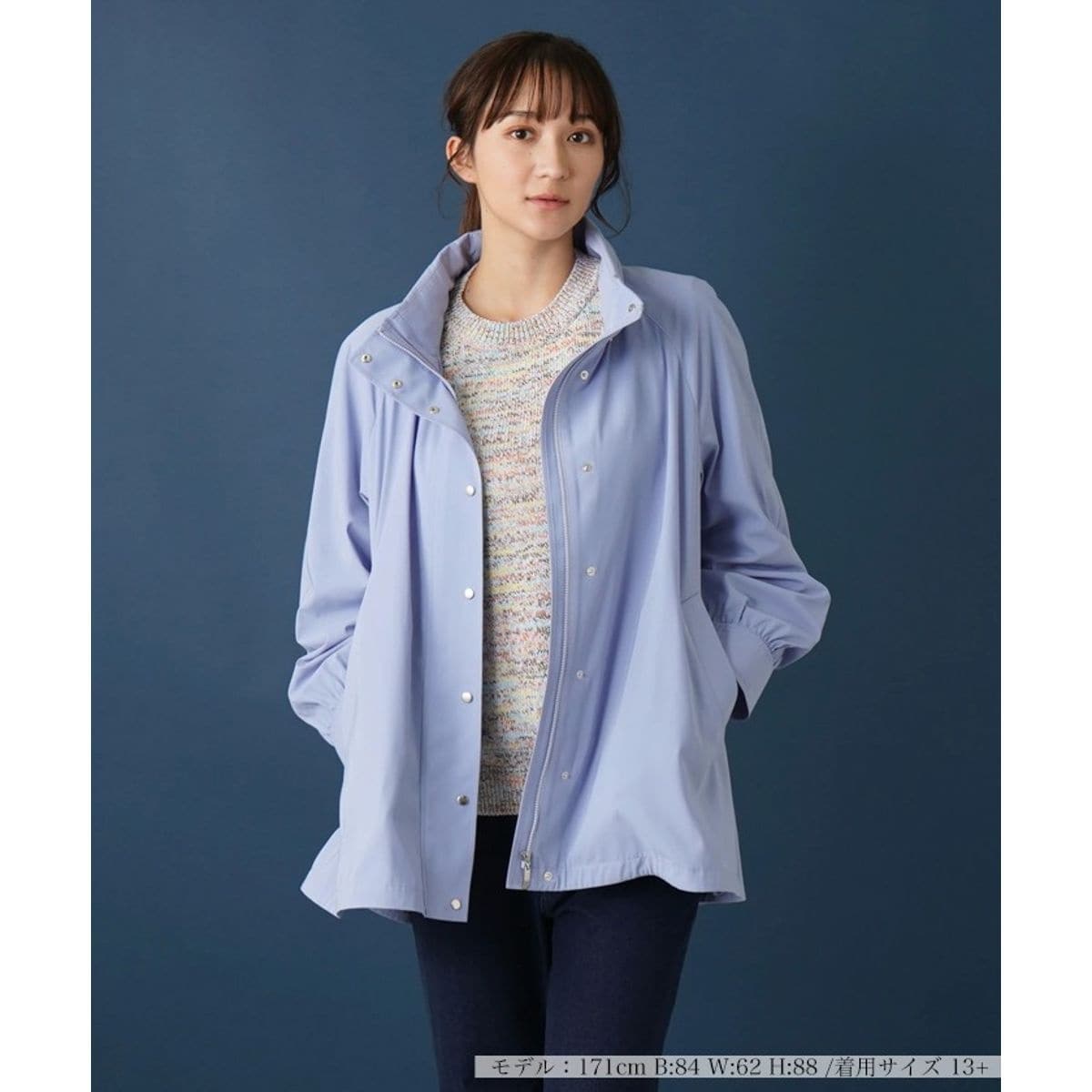 首元までしっかりとカバーできる、スタンドカラータイプのショートコート。襟のファスナーを開けてフードを取り出し、フーディーとしても着こなせる2way仕様。生地には撥水加工を施しているので少々の雨でも安心して着用できます。リラクシーな着心地を叶えるゆったりとしたシルエットでこなれ感たっぷりのスタイリングが楽しめる一着。袖口はゴム仕様とし、心地よいフィット感をもたせています。フロントはスナップボタン&ファスナーにより開閉が可能。