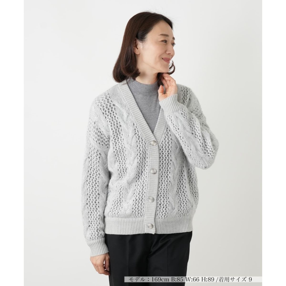 ケーブル編みと繊細な透かし編みを組み合わせた、ドメスティックブランド「H.A.N.D.」のニットカーディガン。モヘヤやアルパカを編み込んだニットは伸縮性があり着心地も快適。スパンコールを散りばめているため、動くたびにさりげなく煌めき、顔周りを華やかに引き立てます。透け感を活かしてインナーとのカラーコーディネートを楽しむのもおすすめです。これからの季節の羽織りとして、スタイリングにフェミニンなアクセントを加える一着です。