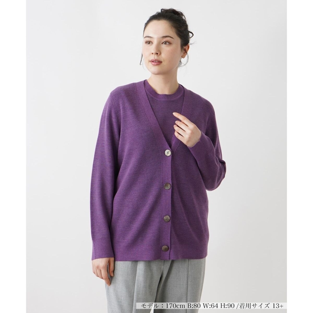 やわらかいウールを使用した薄手のヒップ丈カーディガン。こっくりとしたカラーが秋らしい印象。ゆとりのあるシルエットなので、張り付き感がなくリラクシーな着心地です。