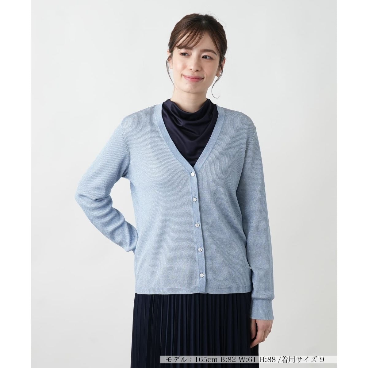 ラメが繊細に煌めく、薄手のVネックカーディガン。控えめながらも上品な輝きが特徴で、シンプルなデザインに華やかさを添えます。すっきりとしたシルエットが、着こなしをスマートに見せつつ、多彩なコーディネートに溶け込む着回し力の高さも魅力です。軽やかな素材感で季節を問わず取り入れやすく、アウター感覚でさらりと羽織ったり、肌寒い日にはジャケットやコートの下でインナーとしても活躍します。