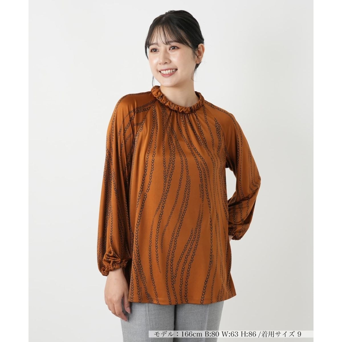 流れるようなチェーン柄が印象的なハイネックブラウス。ネックラインに寄せたギャザーが顔周りを華やかに演出し、肩回りが動かしやすいラグランカットですっきりと仕上げました。袖口はゴム仕様でフィット感をもたせ、ふんわりとしたボリュームスリーブが女性らしさをプラス。伸縮性のある生地を用いており、後ろファスナーで着脱のしやすさも備えています。