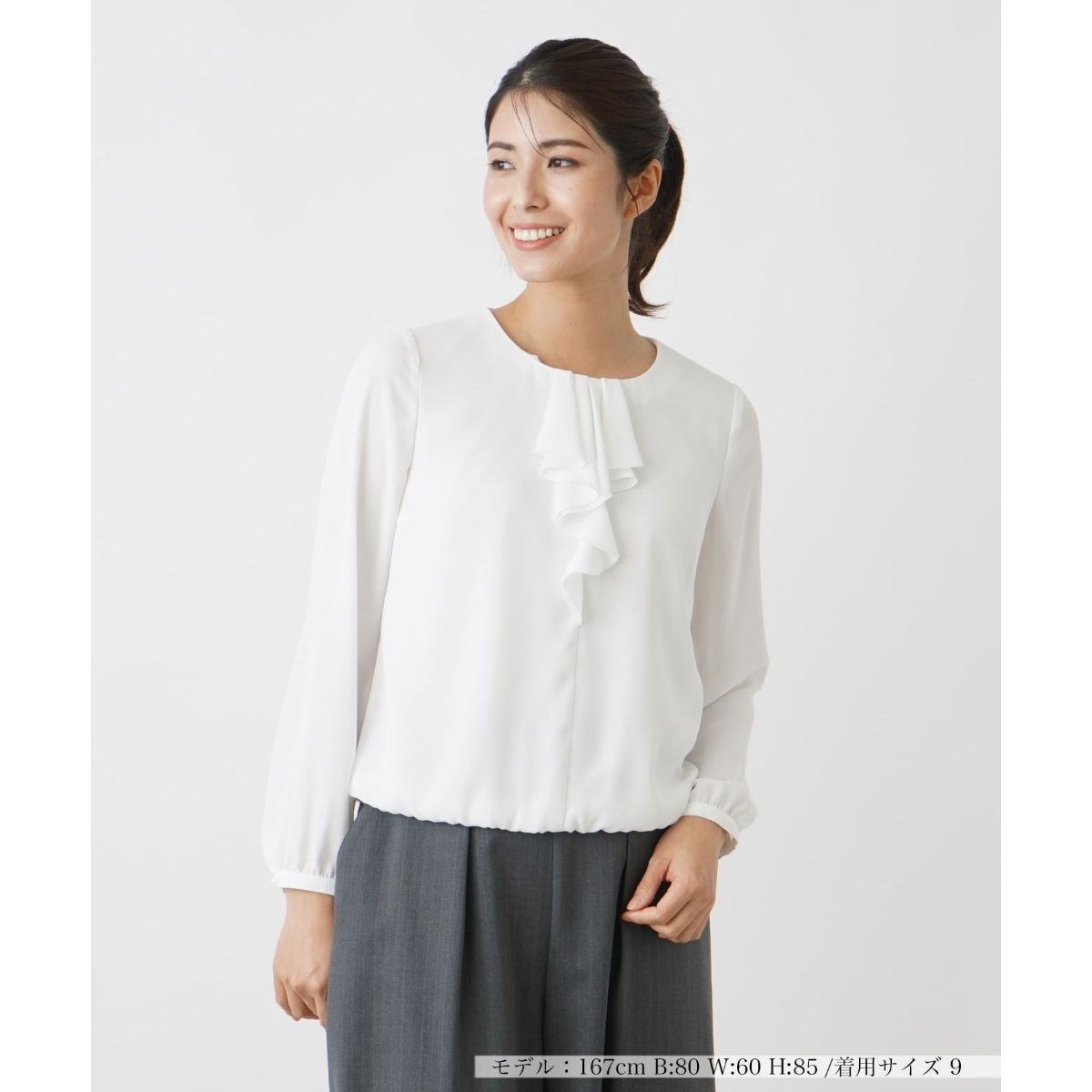 胸元フリルデザインのエレガントなブラウス。表情感のあるアムンゼン素材を使用。透けにくく美しいシルエットが出せる素材です。裾はゴム入りでインしなくても、自然にブラウジングされたシルエットになります。通勤はもちろん、入学式や卒業式にもお使いいただける定番のフリルブラウスです。