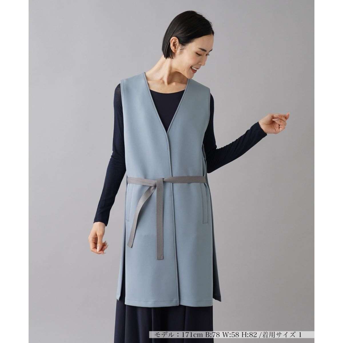 落ち着いたカラーリングとすっきりとしたVネックラインが、エレガントな雰囲気を演出してくれるジレ。フロントはボタンレスで、シンプルでありながらも洗練されたデザインが魅力の一枚です。ウエスト部分にはベルトが付いており、シルエットを引き締める効果があるため、スタイルアップ見せも期待できます。サイドにはさりげなく飾りボタンをプラス。軽やかな生地感で、季節の変わり目のレイヤードスタイルにぴったりです。合わせるインナーやボトムスを選ばず、お手持ちのアイテムの上にさらりと羽織ることでトレンド感のあるスタイリングにアップデートされます。