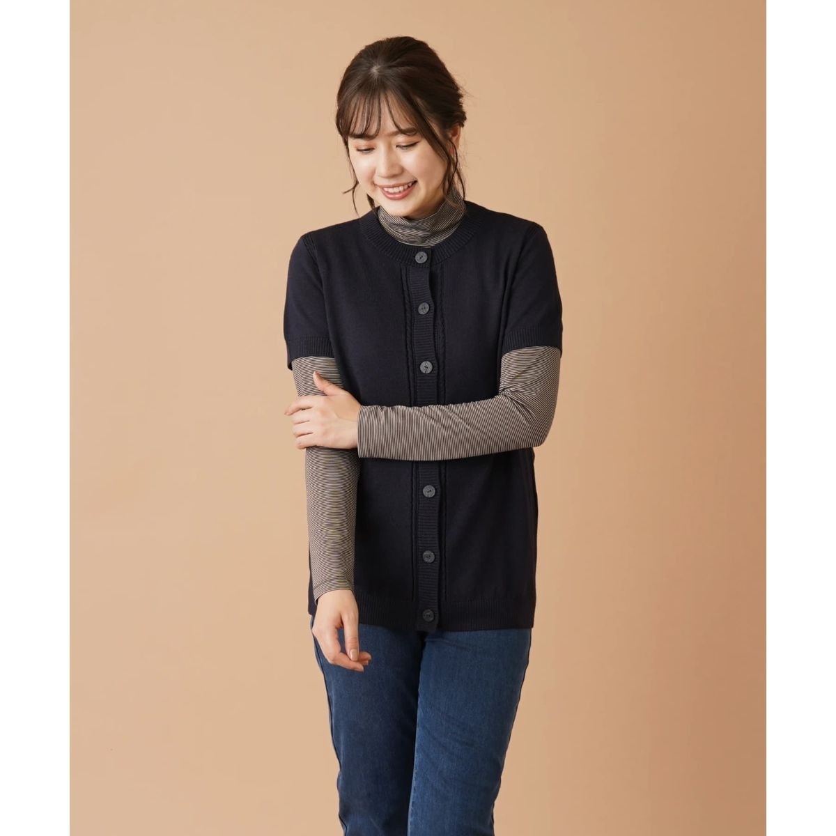 ハイゲージで編んだ滑らかなニットの風合いが楽しめるカーディガン。前立てに施したケーブル模様や同色のデザインボタンがさりげないこだわりを感じさせるアクセントに。すっきりとしたシルエットで着こなしやすく、使い勝手のよいアイテム。ロングスリーブのニットやカットソーに重ねたレイヤードスタイルもオススメです。