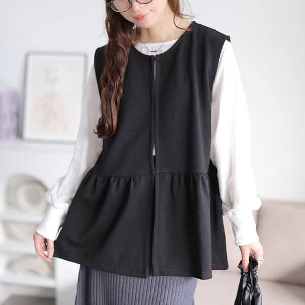 +1でいつものコーデが垢抜ける撥水ペプラムベストの登場です☆撥水機能を兼ね備えたダンボール生地でデイリー~アウトドアシーンまで幅広く大活躍♪ウエスト位置からふわりと広がるフレアペプラムでぽっこりお腹・ヒップラインを大人可愛くカバー◎コーデに響かない前開きホックで開閉が出来るので着こなしのアレンジも自在です♪どんなボトムスとも相性がいいシンプルデザインで着まわし抜群☆