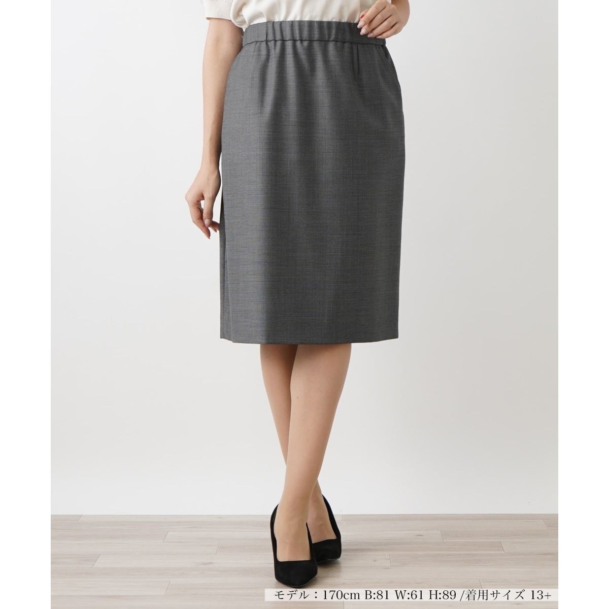 レッグラインを美しく引き立てるミディアム丈のタイトスカート。汎用性の高いベーシックな無地で、やや薄手の上品な風合いのファブリックを使用。後ろ裾にはスリットを入れ、スムーズな足捌きにも配慮しています。ハイウエストでスタイリングできるので脚長見せ効果も狙えそうです。同素材のジャケットとのセットアップコーディネートもおすすめです。後ろホック&ファスナーにより着脱が可能。