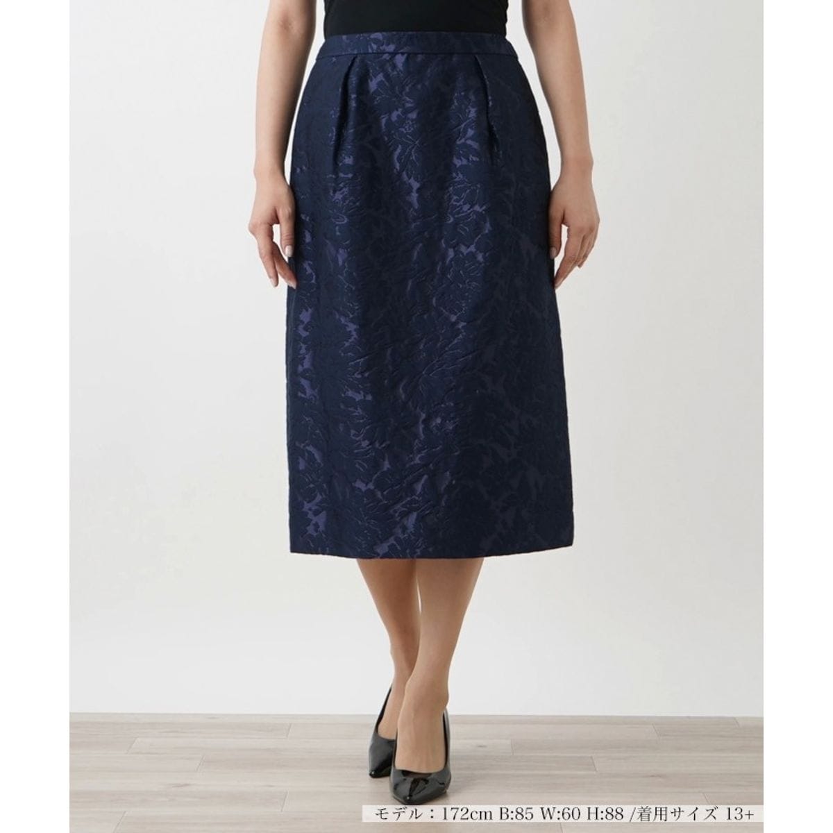 立体感のある花柄が浮かぶ、大人の女性らしい優雅な趣のミディスカート。フロントとバックにバランスよくタックを施すことで、美しいシルエットを描き出しています。後ろ裾には深めのスリットを入れ、スムーズな足捌きにも配慮しました。ウエストには適度な伸縮性があり、はき心地も快適。バックはスナップボタン、ホック&ファスナーにより開閉が可能。同素材のジャケットを合わせてセットアップでのコーディネートもおすすめです。