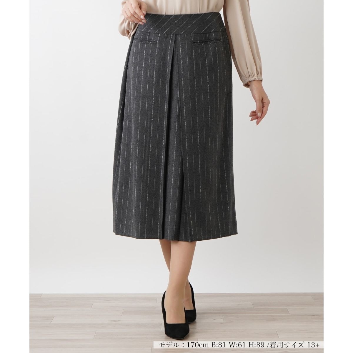 ほんのりとラメが煌めく、レトロシックなピンストライプ生地で仕立てたミモレスカート。フロント中央に施されたインバーテッドプリーツが端正なシルエットを作り出します。ハイウエストでスタイリングできるので、タックインすれば脚長見せのスタイルアップ効果も期待できそうです。前ウエスト左右にシンプルなスリットポケットをレイアウト。後ろホック&ファスナーにより開閉が可能です。