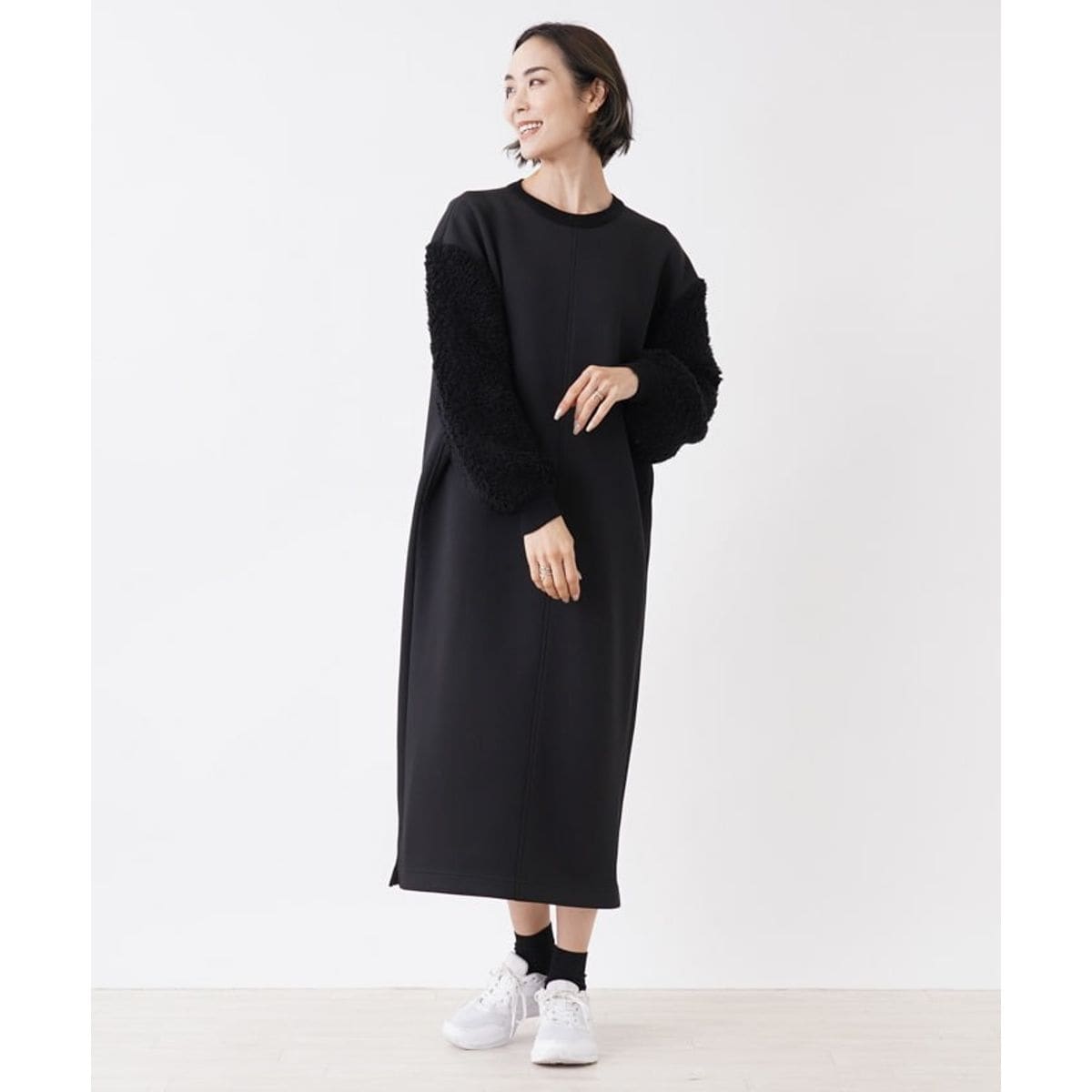 毛足長めのふわふわボアスリーブが、ほっこりとシーズンらしさを後押ししてくれるロングワンピース。ネックラインは浅めに設定し、落ち着いた上品な佇まいに仕上げました。裾サイドにはさりげなくスリットが入っているので、適度な抜け感を演出してくれます。ボディはシンプルにまとめているからやりすぎ感なくスタイリングでき、デイリーユースにぴったり。一着でサマになるので、ワードローブにあると重宝するアイテムです。首元にネックレスやスカーフなど小物アレンジで華やかさのある着こなしに。
