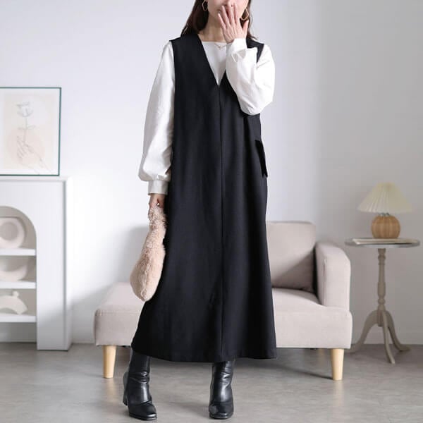 真っ直ぐ落ちるIラインシルエットでスッキリ見せ☆フラップポケットVネックジャンパースカートが登場です!お顔まわりにスッキリとした印象を与えてくれる深Vネックのデザインで小顔効果抜群◎ストンっと真っ直ぐ落ちるIラインシルエットで縦ラインを強調しスタイルUP効果も♪ゆったりとした脇ぐり設計で多様なインナーに対応◎インナーを変えることでロングシーズン着まわせるのも嬉しいポイント☆