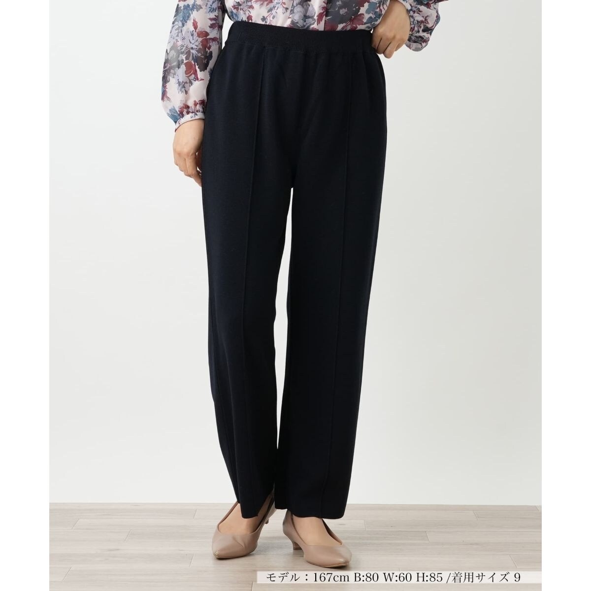 しなやかなミラノリブを使用したニットパンツ。フロントの縦ピンタックラインは脚長効果を演出。すっきりと流れるような印象に。※商品の色味は、撮影場所や光のあたり具合、お客様のお使いの機器により色味が違って見える場合がございます。予めご了承ください。