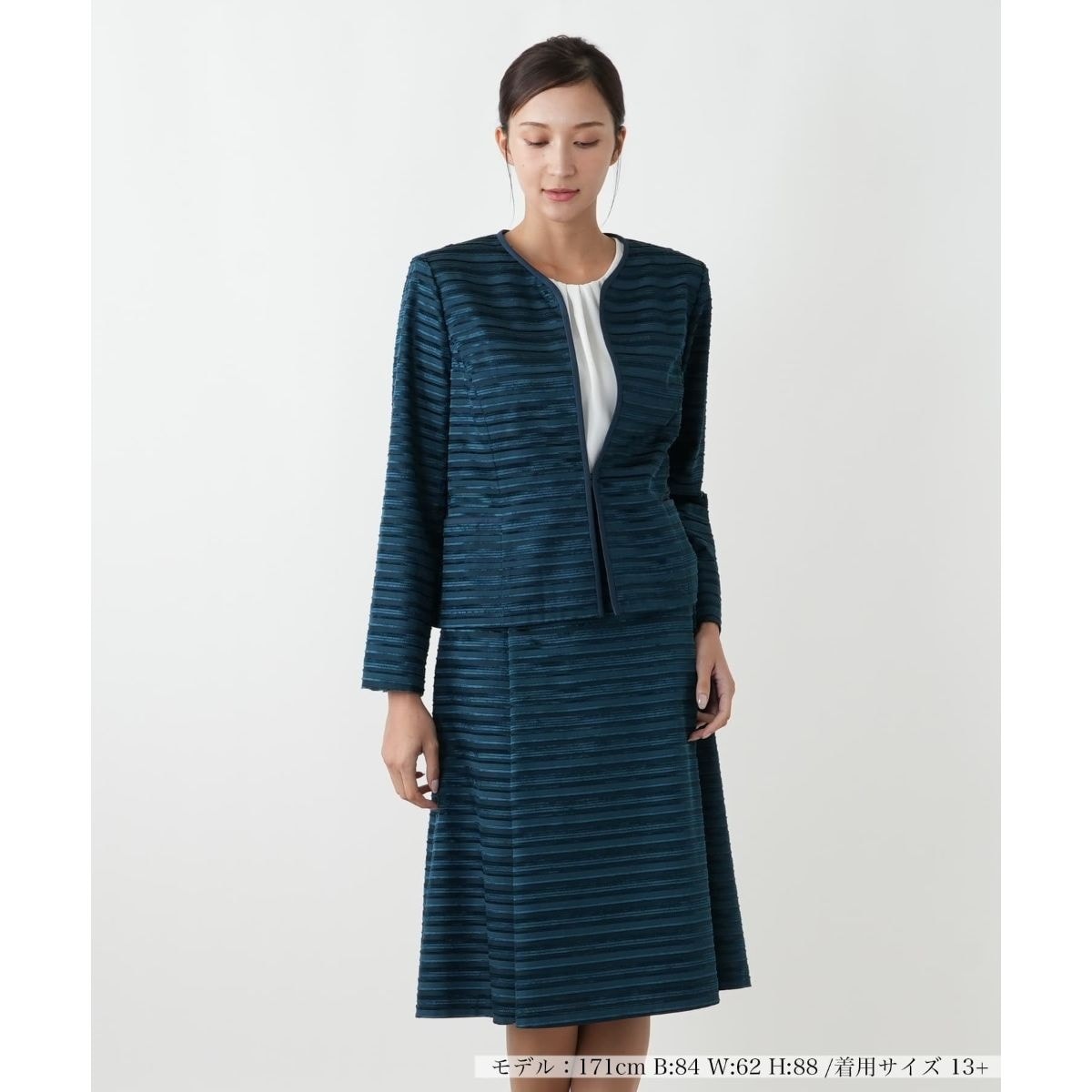 セレモニーシーンにふさわしい、ボーダー柄のスーツ。ポリエステル100%で仕立てられた素材は、しなやかな肌触りと美しい光沢感が特徴です。控えめなボーダー柄が、派手になりすぎず、洗練された印象を与えます。長袖の襟のデザインが、大人の女性の品格を際立たせます。裏地にはキュプラを使用し、滑らかな袖通しで快適な着心地です。入学式、卒業式、結婚式といったお祝いの席から、ビジネスシーンまで、幅広いフォーマルな場面で活躍する一着です。