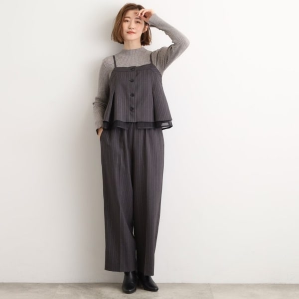 透け感あるオーガンジーを効かせたキャミビスチェと、センタープレス入りワイドパンツのセットアップ。