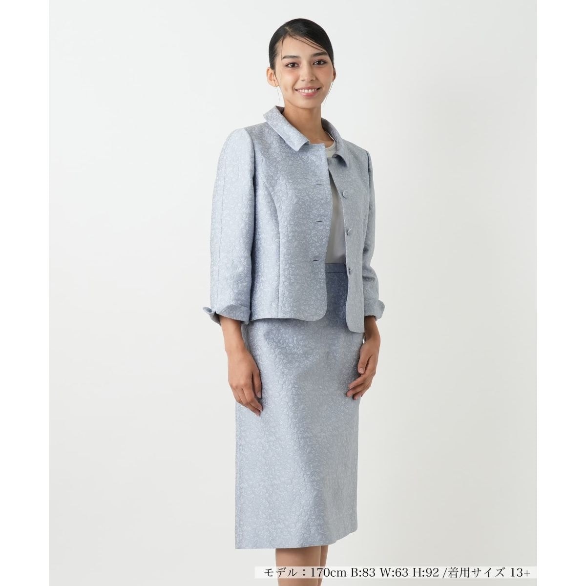 国内有数のジャカード織り産地、桐生で作られたフラワーレースジャカード素材を用いたスーツ。ジャケットは丸みのあるショールカラーと、女性らしい優しい印象の裾ラウンドデザインが特徴です。繊細なくるみ釦が細部にまでこだわりを感じさせます。七分袖で軽やかながらも品格のある佇まいに。一枚で装いが完成する、特別な日のための装いとして、上質な着心地とともに優雅な時間をお届けします。