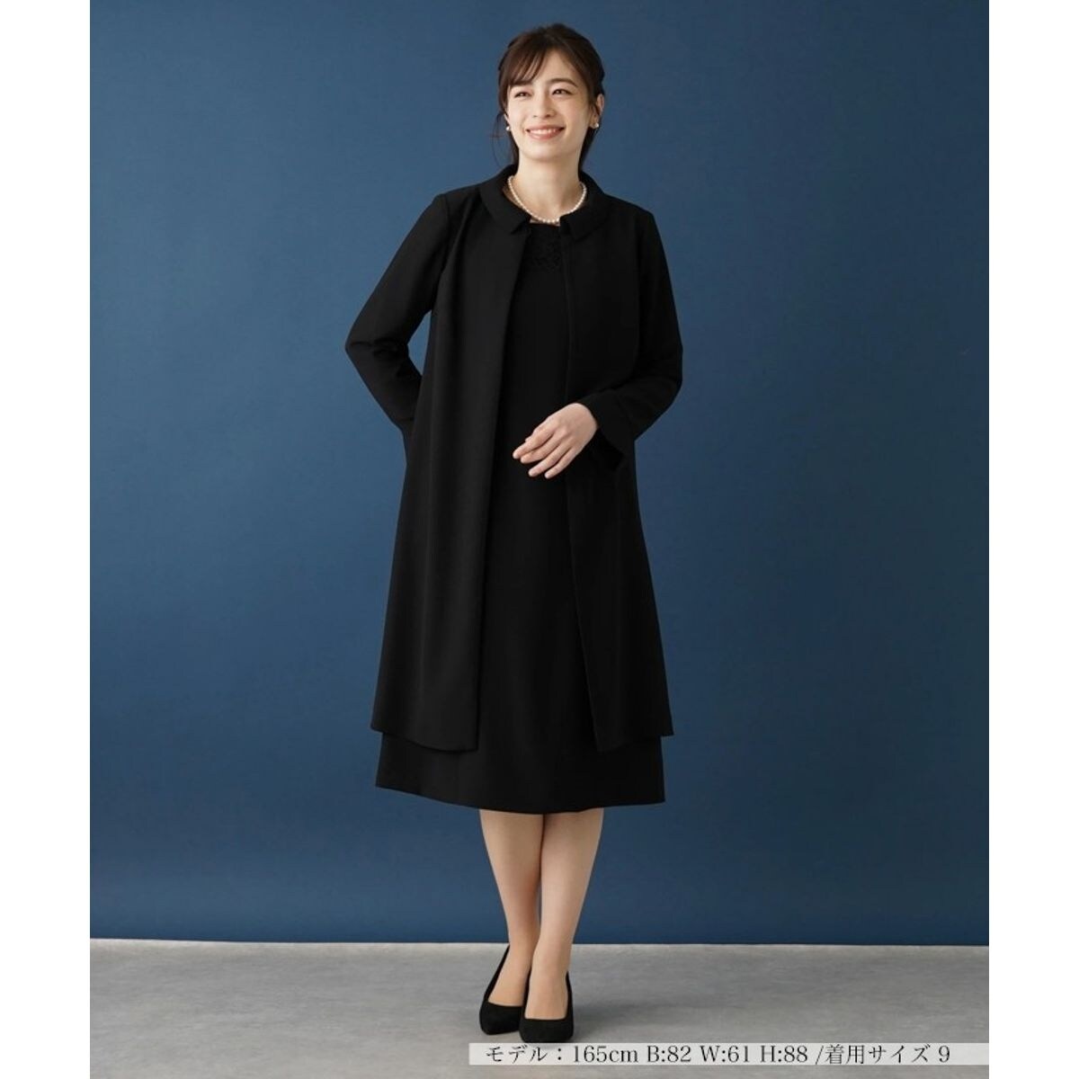 小さめ襟が特徴的なフォーマルなロングジャケットと、ミディ丈ワンピースのセットアップです。深いブラックは高級感を漂わせ、様々なセレモニーにふさわしい大人の着こなしを演出。ワンピースは控えめながらも愛らしさを感じさせ、トップスにあしらわれたレースがデコルテを上品に彩るエッセンスに。ジャケット首元はループボタン、ワンピースフロント部分はファスナーにより着脱が可能。特別な日のワードローブに加えるのに最適なアイテムです。