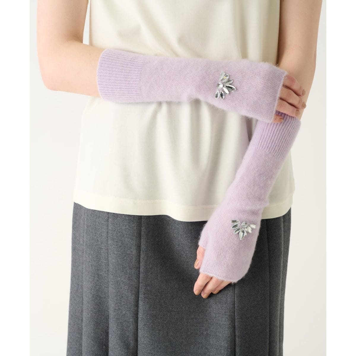 ウールですが、原毛の太さがカシミヤに近いものを選別し使用しています。編み上がりの手触り感がカシミヤに近い柔らかさになるよう仕上げています。レリアンオリジナルでニュアンスのあるウインターパルテルのカラーを展開し、暖かみと大人のかわいらしさを表現。ワンポイントのアクリルビジューでさらに華やかさをプラスしたニットアームカバーです。