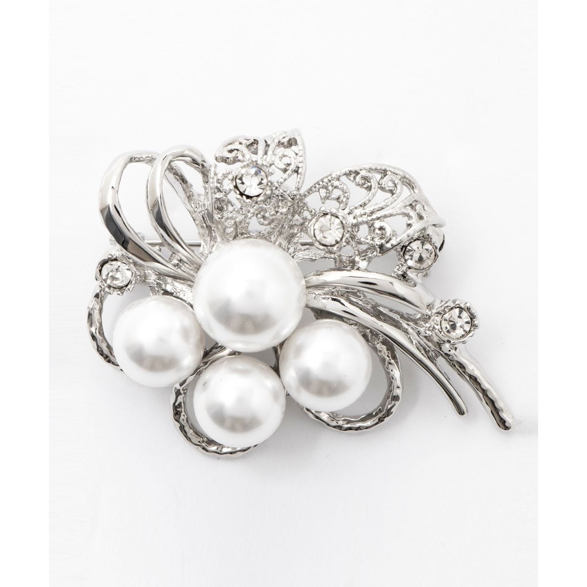 上品なパールと煌びやかなラインストーンを組み合わせたエレガントなブローチです。シルバーベースの繊細なデザインが華やかさを引き立て、フォーマルな装いにぴったりのアクセサリーです。ボリューム感のあるパールが中心に配置され、立体感と高級感を演出。ドレスやジャケット、バッグにアクセントとして付けるだけで、一気に洗練された印象に仕上がります。結婚式やパーティーなど、特別なシーンで活躍するアイテムです。