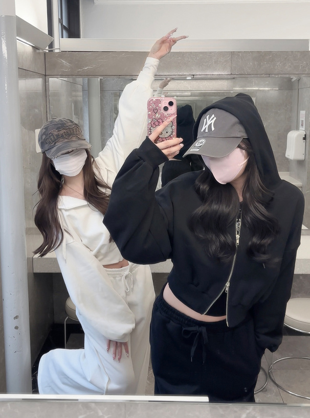パーカーはやや短めの丈感にダブルジップ仕様で、おなかをチラ見せした今っぽい着方ができる。
