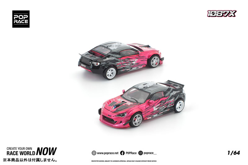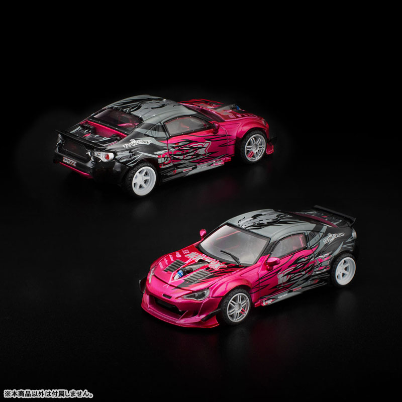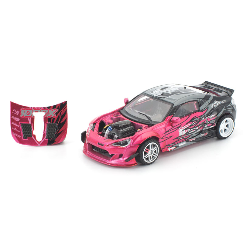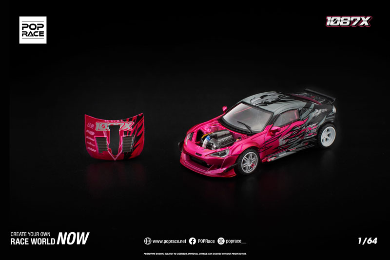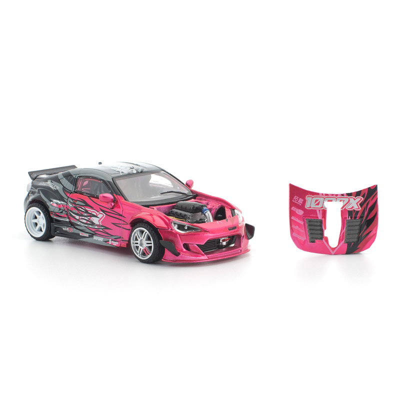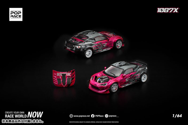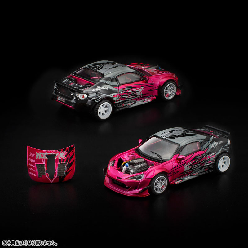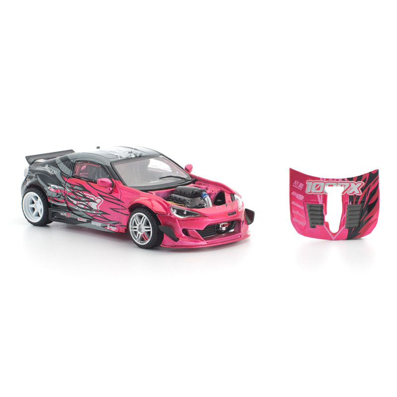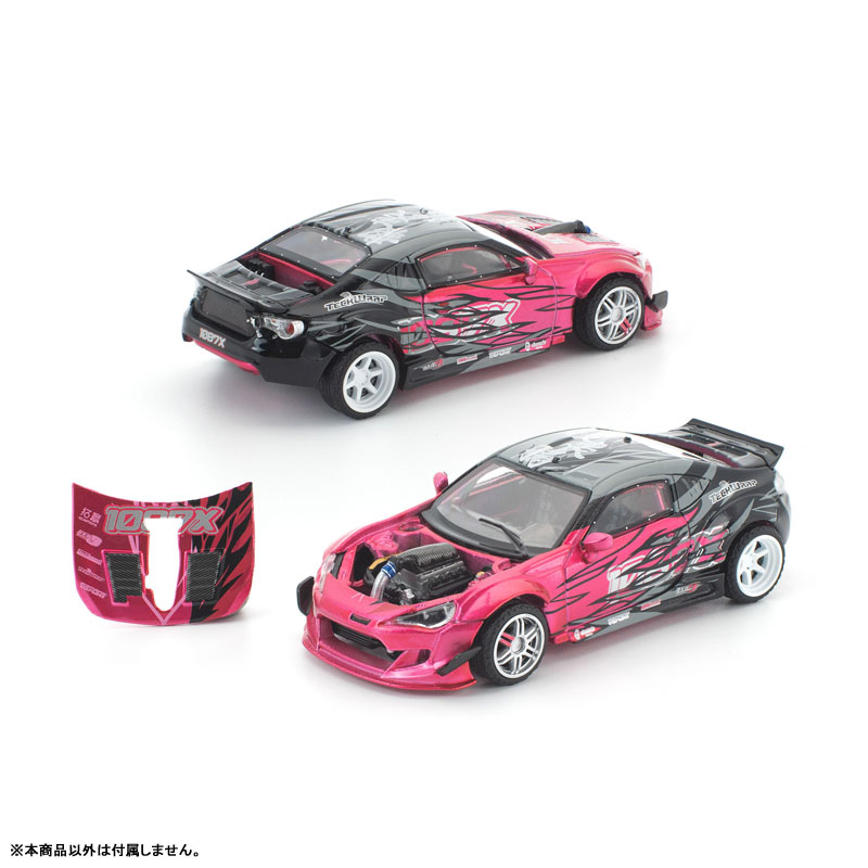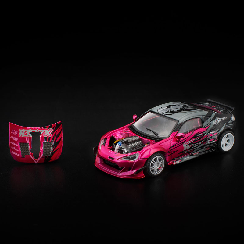中国の人気ドリフトチーム「1087X」によって製作された、トヨタ「GT86」ベースの競技用ドリフトマシンが、「POP RACE」×「XCARTOYS」より1/64スケールで登場。実車の迫力を放つピンクのボディに、“鴉(カラス)”をモチーフとした黒のアクセントリバリーを精密塗装で再現。前後で異なるホイールデザインも、実車同様に忠実に再現しています。搭載されたハイパワーエンジンや、バンパー開口部に配置されたインタークーラー、配線などの複雑な構造をパーツ分割成型で立体的に表現。エンジンフードはマグネット式の脱着ギミックを採用し、精密に造形されたエンジンルーム内部をじっくりと堪能できます。さらに、リアセクションに搭載されたリアマウントラジエーターを完全再現。車体底面にも、リアサスペンションアームやLSDデフ、ハブ構造、マフラー、サブフレームといった細部までを別パーツで精密に造形しています。