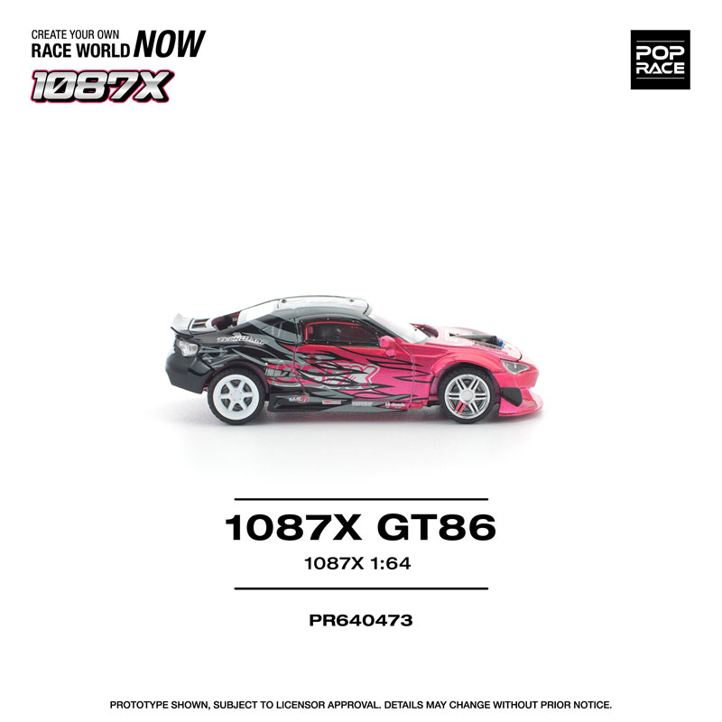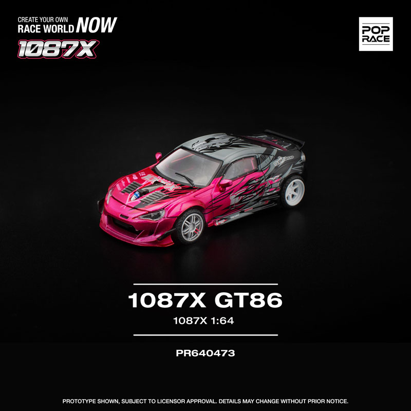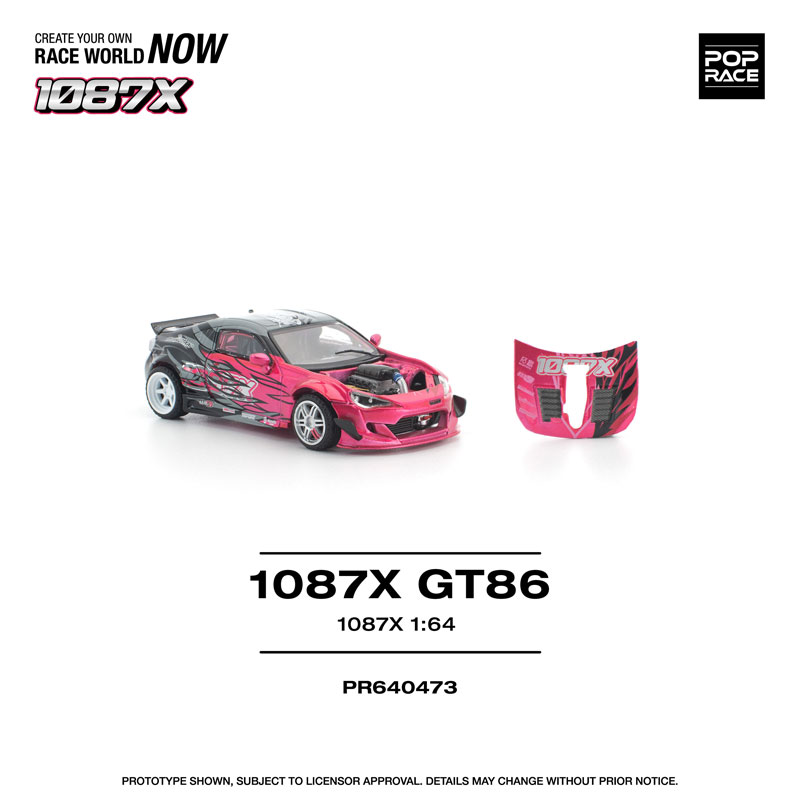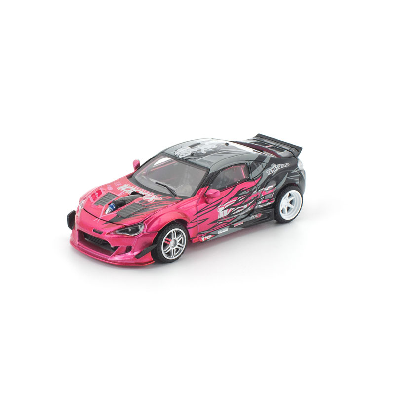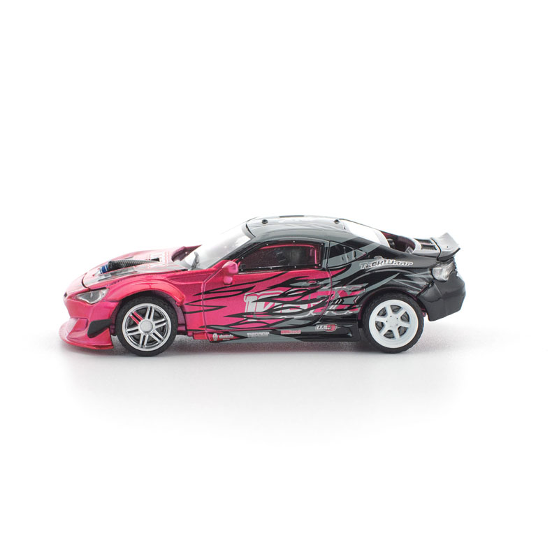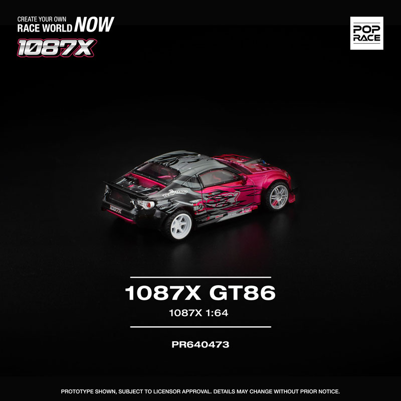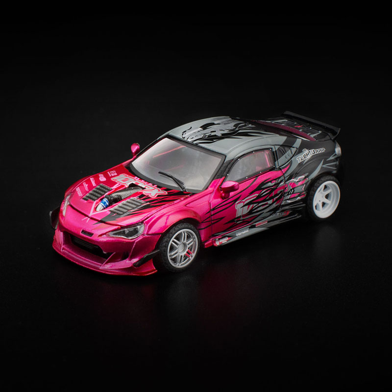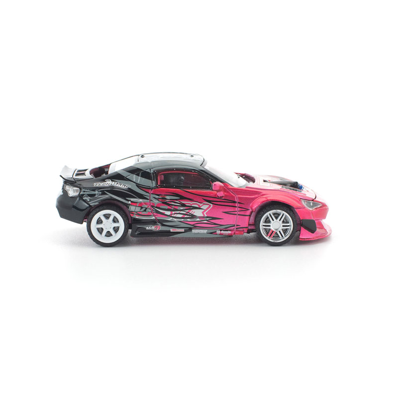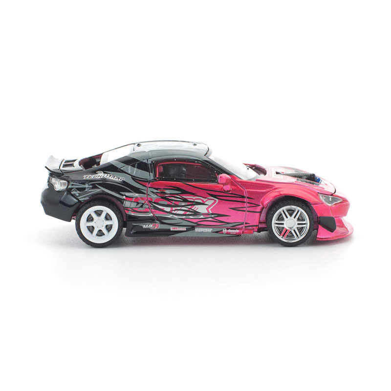 中国の人気ドリフトチーム「1087X」によって製作された、トヨタ「GT86」ベースの競技用ドリフトマシンが、「POP RACE」×「XCARTOYS」より1/64スケールで登場。実車の迫力を放つピンクのボディに、“鴉(カラス)”をモチーフとした黒のアクセントリバリーを精密塗装で再現。前後で異なるホイールデザインも、実車同様に忠実に再現しています。搭載されたハイパワーエンジンや、バンパー開口部に配置されたインタークーラー、配線などの複雑な構造をパーツ分割成型で立体的に表現。エンジンフードはマグネット式の脱着ギミックを採用し、精密に造形されたエンジンルーム内部をじっくりと堪能できます。さらに、リアセクションに搭載されたリアマウントラジエーターを完全再現。車体底面にも、リアサスペンションアームやLSDデフ、ハブ構造、マフラー、サブフレームといった細部までを別パーツで精密に造形しています。