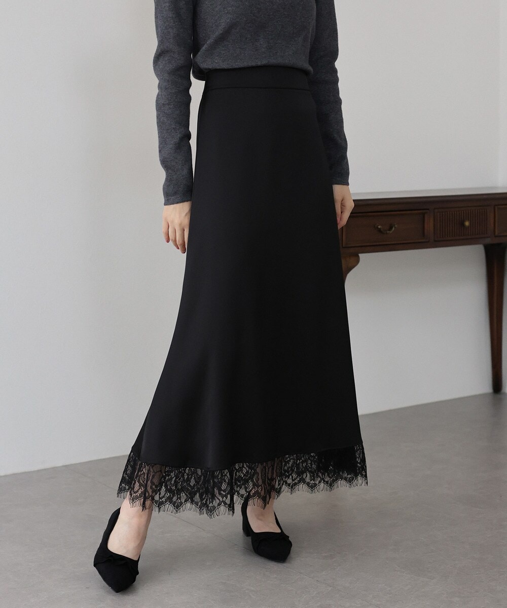 裾に繊細なレースをあしらった、女性らしい印象のサテンスカート。