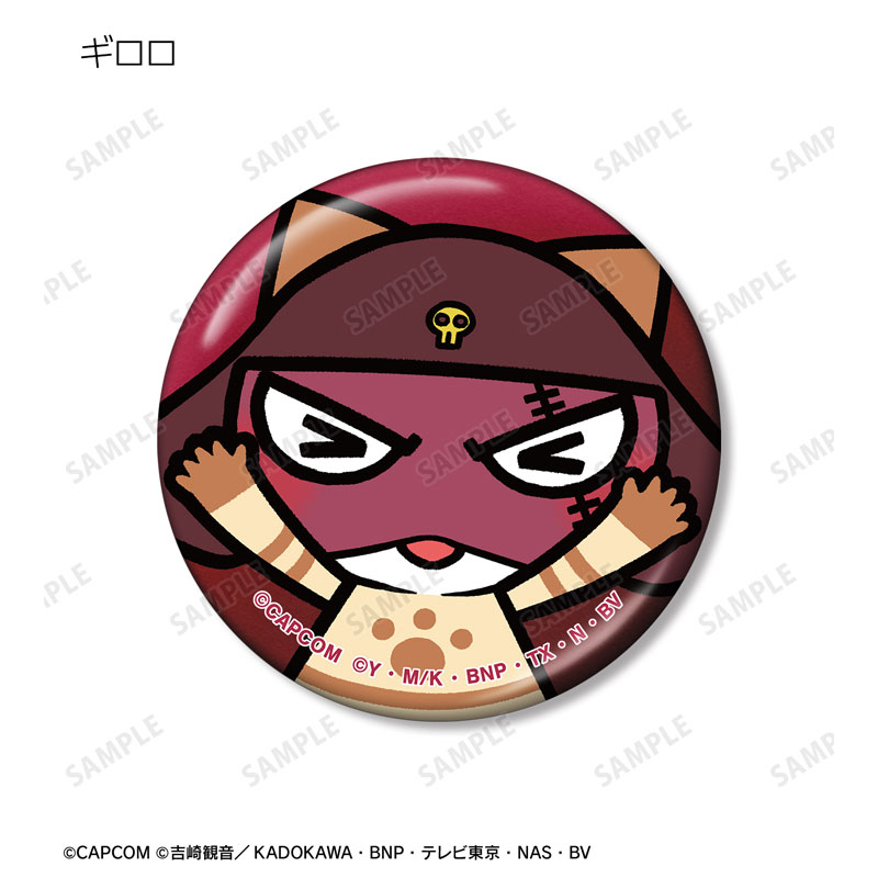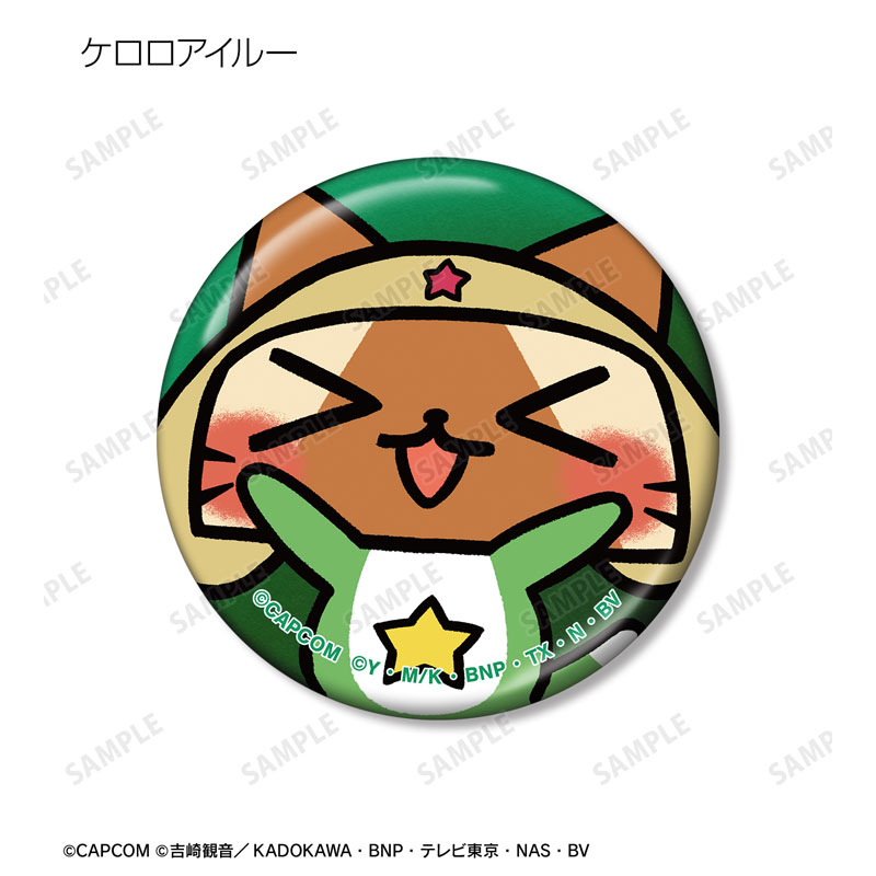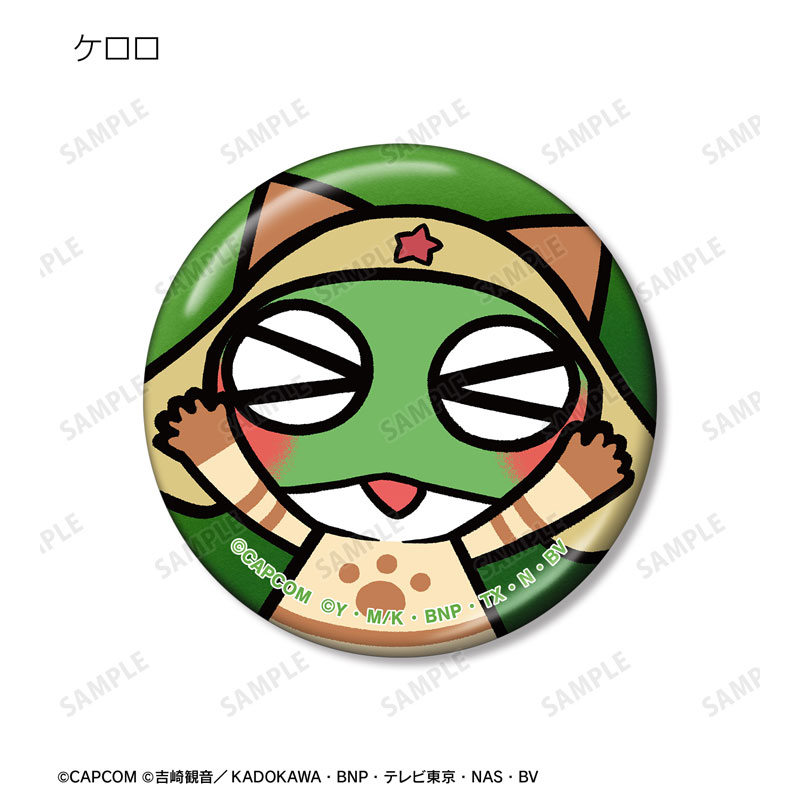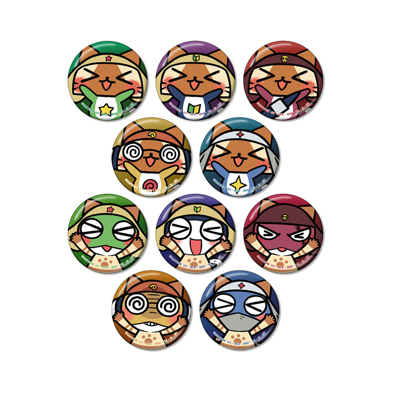 ケロロアイルー、タママアイルー、ギロロアイルー、クルルアイルー、ドロロアイルー、ケロロ、タママ、ギロロ、クルル、ドロロのイラストをメタリック仕様の缶バッジに仕上げました。