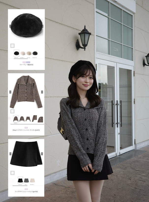 大きめの襟デザインや配色ボタンが、抜け感のあるアクセントに。