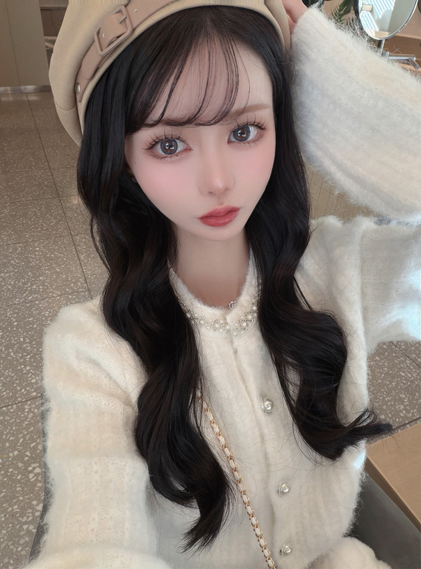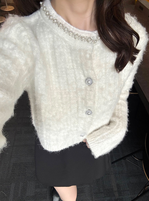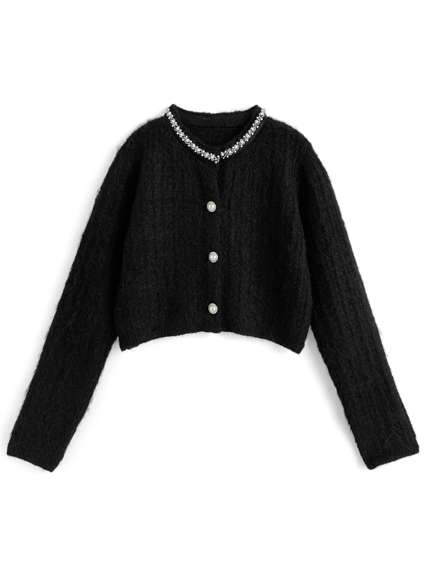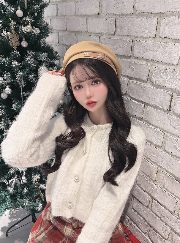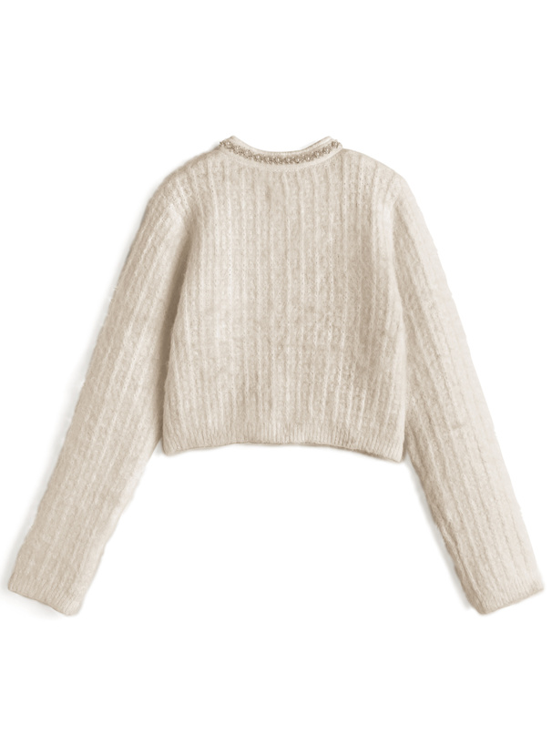 首元にビーズやパールを散りばめ、顔まわりを華やかに演出。