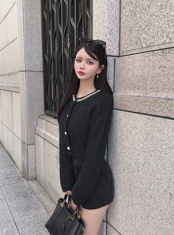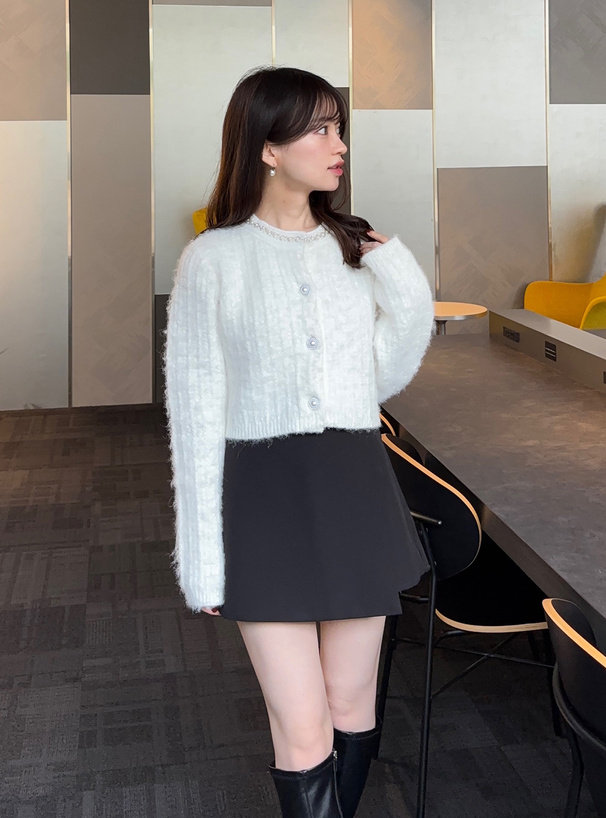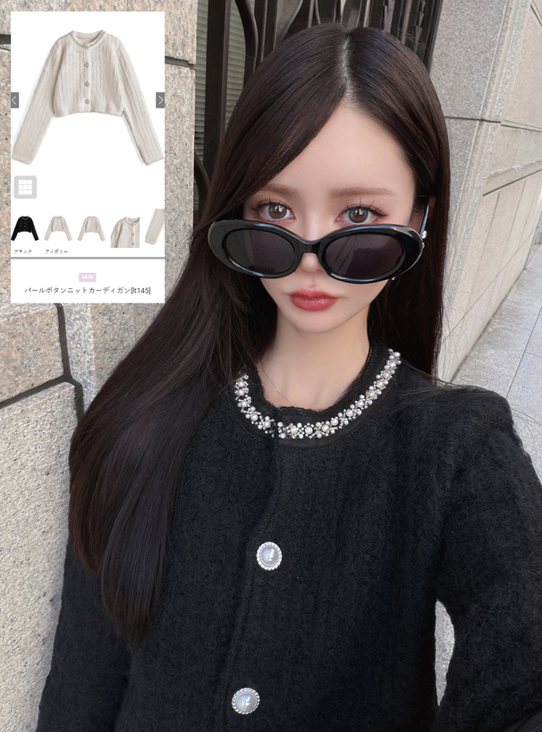 存在感のあるパールボタンも、女性らしさ漂うアクセントに。