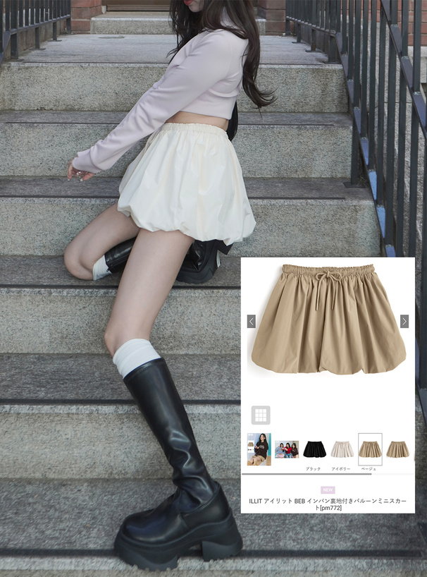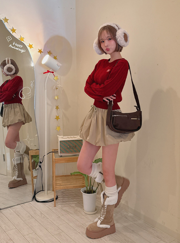 ボリュームたっぷりなバルーンシルエットが女性らしさを引き立てる。