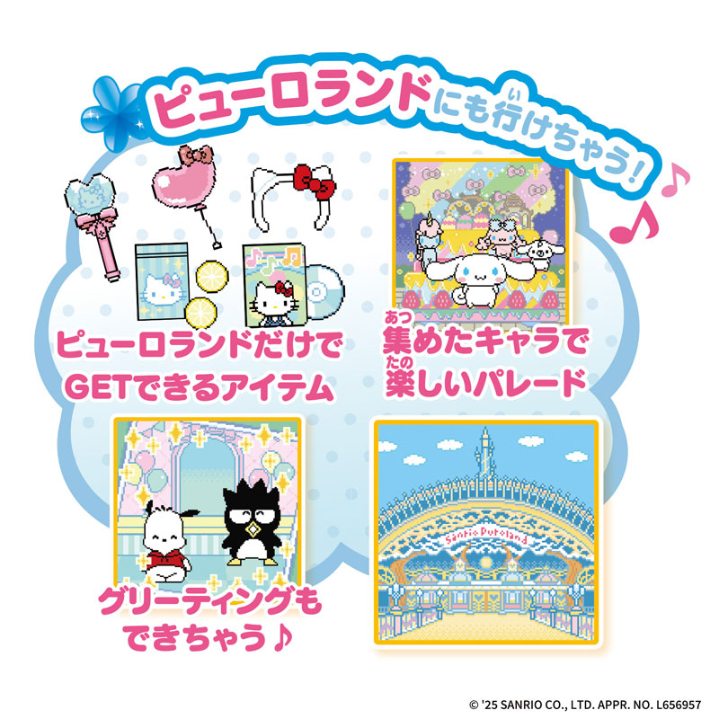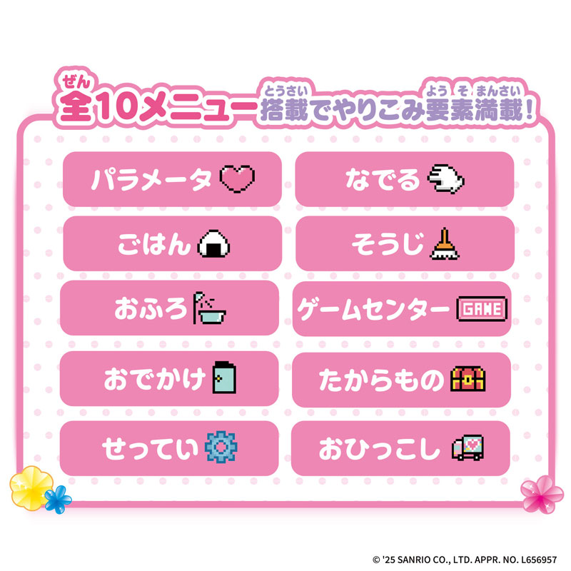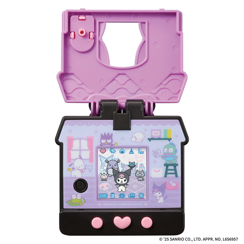 サンリオキャラクターズがいっぱい登場する、かわいい液晶アイテムです。 おうち型本体の呼び鈴ボタンを押すと、窓からキャラクターのかわいいリアクションを見ることができます。フタを開けると、お部屋が出てきて、お世話遊びが楽しめます。