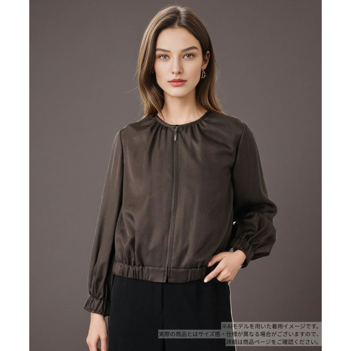 上品な光沢感と、とろみのある風合いの生地で仕立てたノーカラージップブルゾン。ネックラインに寄せたギャザーが、顔周りに柔らかなニュアンスを添えてくれます。裾と袖口はゴムで絞り、ふんわりと立体感のあるシルエットをメイク。スカートと合わせてフェミニンに、パンツに合わせてきれいめカジュアルにと、これからの季節のコーディネートの幅を広げてくれる使い勝手のよいアウターです。